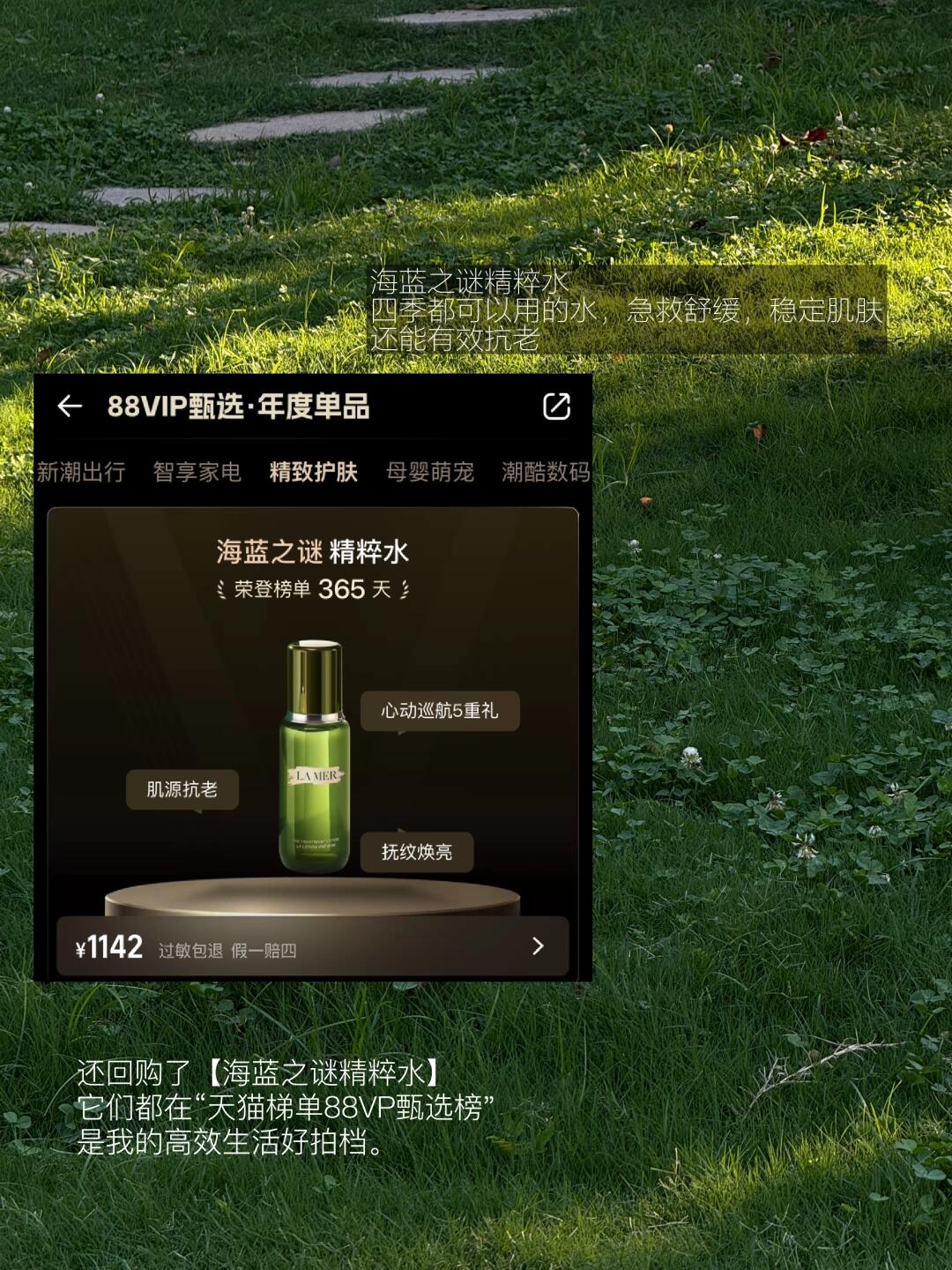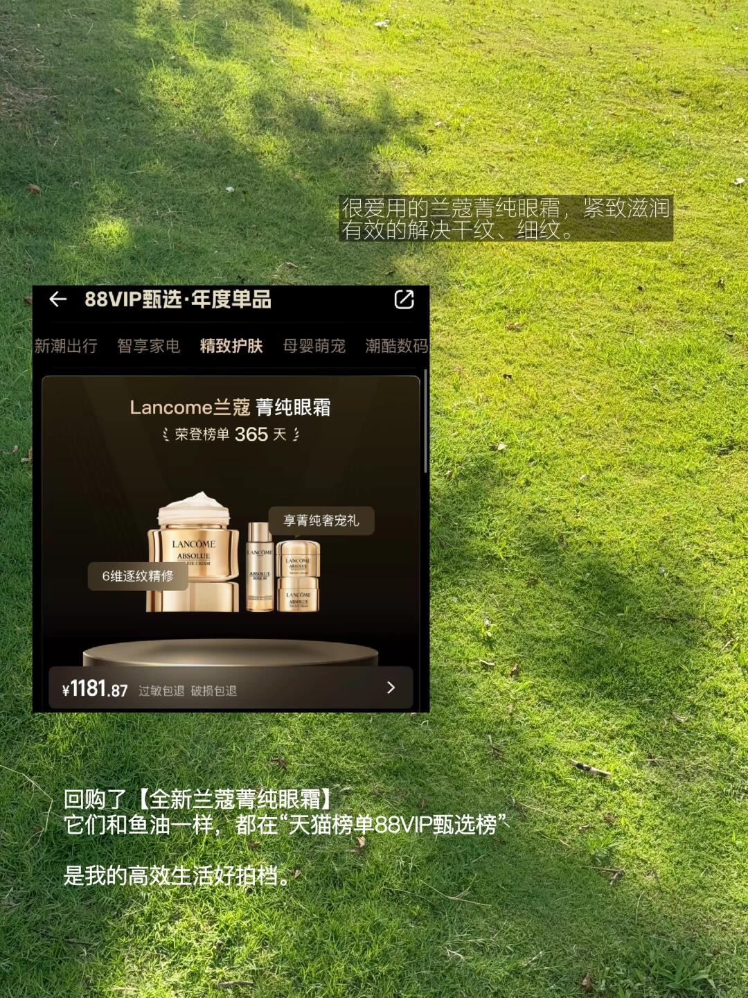 我这回还回购了“「全新兰蔻菁纯眼霜」、「海蓝之谜精粹水」还有「海信小墨E5Q Pro」它们和鱼油一样,都在天猫榜单88VIP甄选榜上!是我的高效生活好拍档。