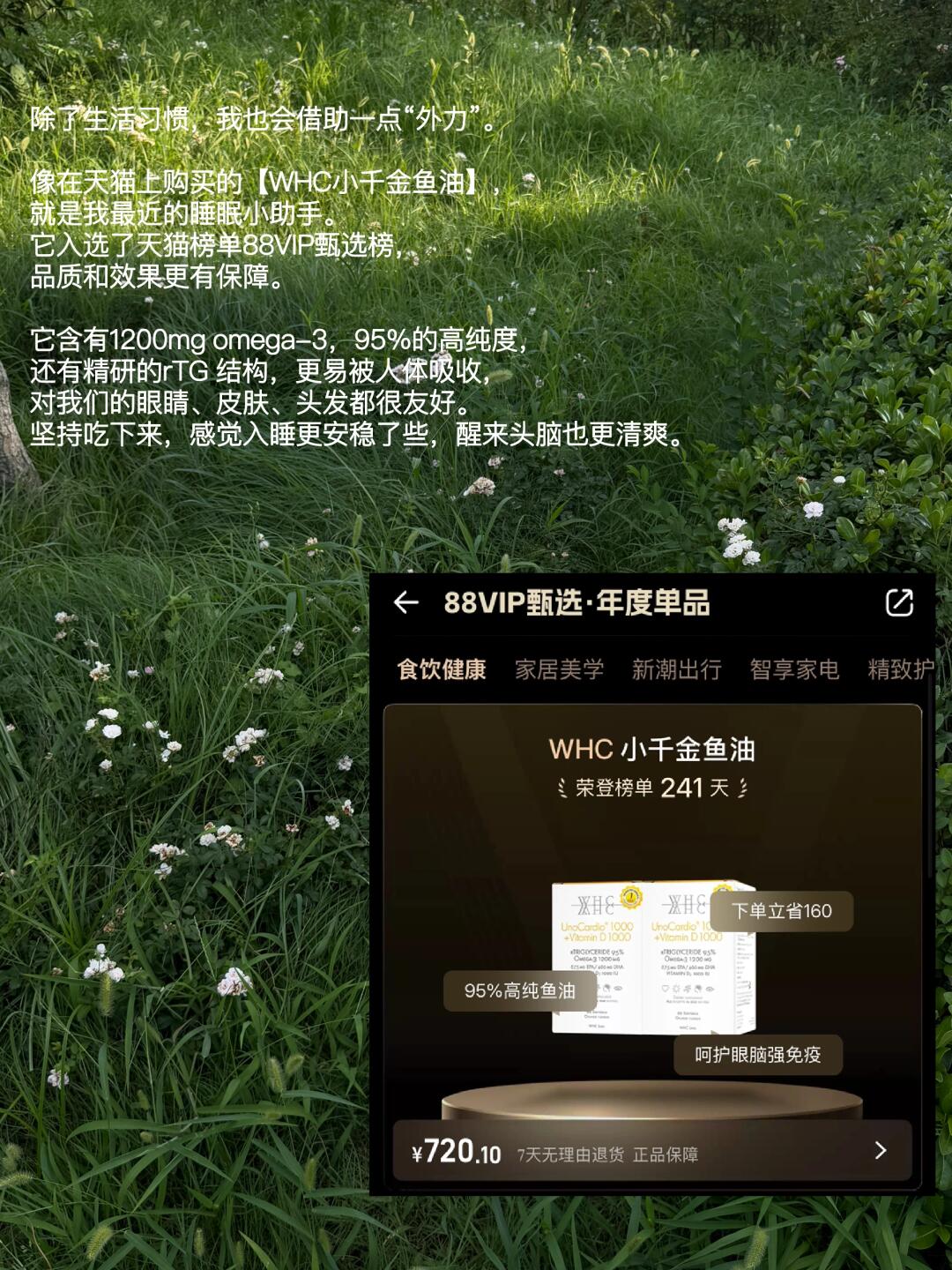 像在天猫上购买的「WHC小千金鱼油」,就是我最近的睡眠小助手。它入选了天猫榜单88VIP甄选榜,品质和效果更有保障。它含有1200mg omega-3,95%的高纯度,还有精研的rTG结构,更易被人体吸收,对我们的眼睛、皮肤、头发都很友好。 坚持吃下来,感觉入睡更安稳了些,醒来头脑也更清爽。