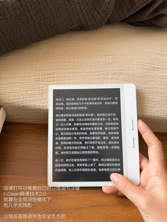 阅读灯可以根据环境调节冷暖。i-Clean瞬清技术2.0,就算在全局深色模式下,瞬清几乎无残影。让我在夜晚读书时也完全无负担。