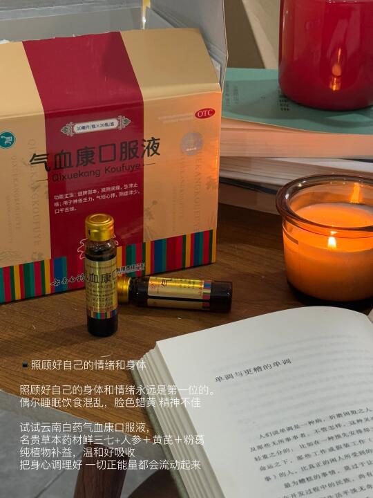 照顾好自己的身体和情绪永远是第一位的。偶尔睡眠饮食混乱,难免脸色蜡黄、精神不佳。服用云南白药气血康口服液。它采用名贵草本药材——鲜三七、人参、黄芪和粉葛,其中鲜三七来自云南白药公司自有GAP基地,采收后24h内入药,总皂苷含量比干三七高出28%。纯植物补益,温和易吸收,把身心调理好,一切正能量都会随之流动。