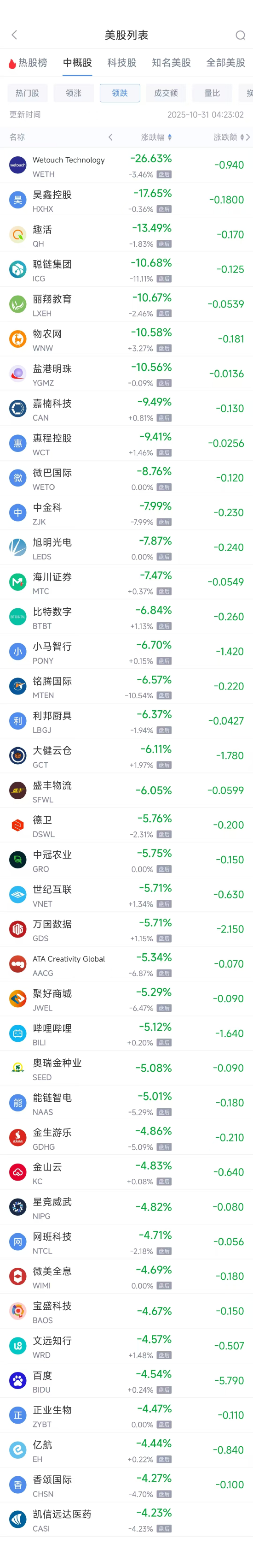 下跌股当中(按市值从高到低),台积电跌0.59%,阿里巴巴跌3.36%,拼多多跌1.50%,网易跌4.10%,京东跌2.88%,携程跌2.65%,百度跌4.54%,腾讯音乐跌3.14%,中华电信跌0.37%,富途控股跌4.01%,理想汽车跌2.34%,小鹏汽车跌0.99%,贝壳跌2.98%,蔚来跌1.68%,中通跌1.76%,满帮跌0.75%,哔哩哔哩跌5.12%,BOSS直聘跌0.67%,中国新城农村跌3.21%,唯品会跌3.66%,小马智行跌6.79%。
