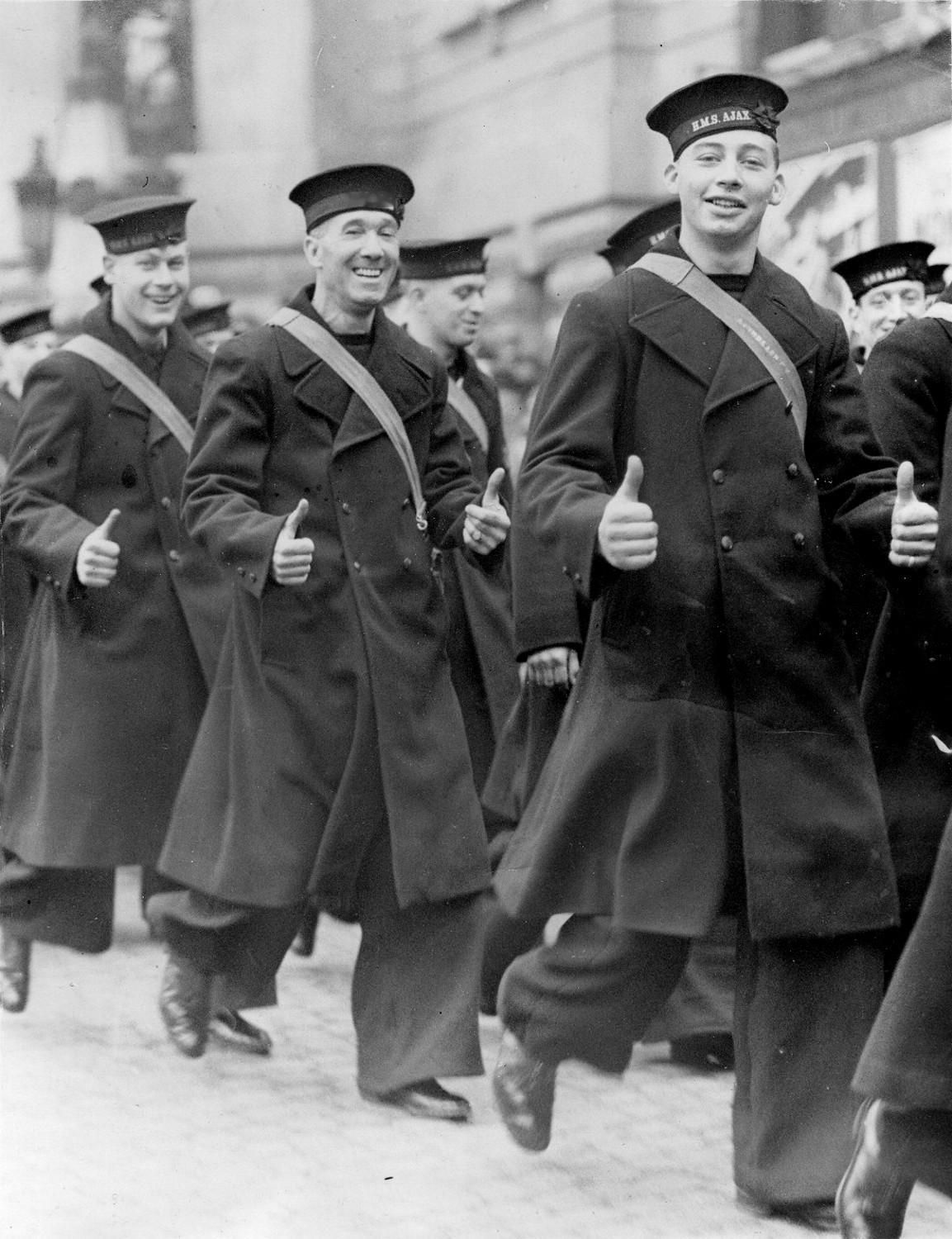 [呲牙] 看把你们得瑟的——1940年2月23日,英国轻巡洋舰“阿贾克斯号”水兵行进在伦敦街头。“阿贾克斯号”曾参与1939年围歼德国“海军上将格拉夫·斯佩号”重型巡洋舰的战斗,它的水兵们看上去自信又放松。 “阿贾克斯号”(HMS Ajax,参见图2)属于利安得级轻巡洋舰,配备8门6英寸主炮,与埃克塞特号、阿基里斯号共同参与拉普拉塔河口海战,此役成为二战首次重大海战。 “海军上将格拉夫·斯佩号”(Admiral Graf Spee pocket battleship,参见图3)是德国德意志级装甲舰的三号舰,以破交作战为主要任务,1939年12月在拉普拉塔河口海战遭三艘英舰围剿后自沉。