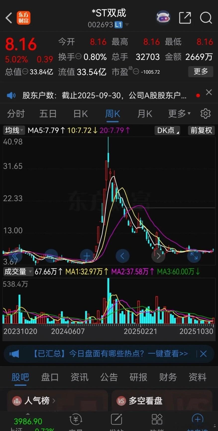 去年的十倍大牛股双成药业,因重组跨界并购半导体被疯狂爆炒,从不到4元炒到了最高40.98元,大涨超过10倍。后来跨界重组失败,股价开始惨烈下跌,今年年报后又被实施退市风险警示,股价再次崩盘式下跌,最低跌到了6.32元,相当于较高点腰斩了近三次,高位套牢股民亏得鼻青脸肿!