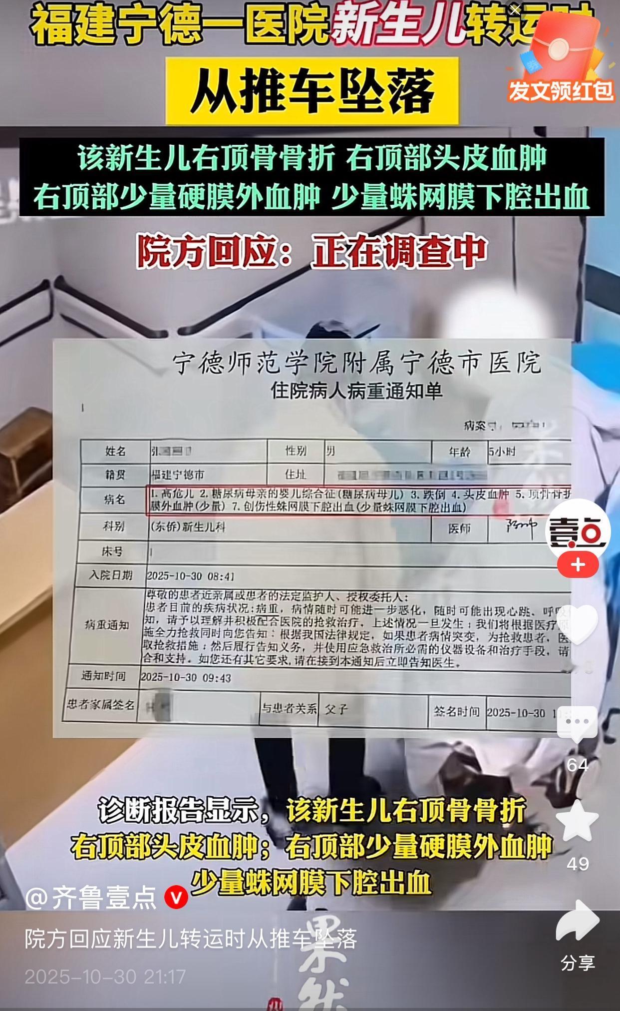 仔细看视频才发现,新生儿由这位母亲抱着,在这个过程中,新生儿突然掉落在地的,有几点想不明白: 一,产妇刚生完孩子全身没力,为什么要把新生儿给产妇抱呢?完全抱不住啊,再说了要放也放两腿之间嘛! 二,新生儿出生后应该是交由家属吧!或者有个单独的婴儿车推孩子啊。 三,就算排除上面的,那也应该把护栏锁好呀,孩子就不会掉下来了。