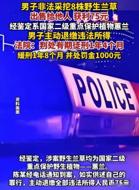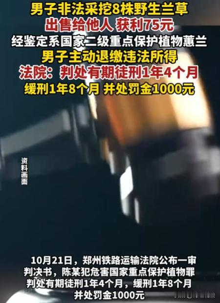 河南,男子陈某在山上非法采挖了8株野生兰草并出售,获利75元。这些兰草经鉴定为二级重点保护植物蕙兰。郑州铁路运输法院公布一审判决,陈某因犯危害重点保护植物罪,被判有期徒刑1年4个月,缓刑1年8个月,并处罚金1000元。 (来源:裁判文书网、极目新闻、红星新闻、深圳新闻网) 从裁判文书网获悉,陈某,是栾川县的一个农民,小学没毕业,只能打零工,讨生活。 2024年4月14日,他明知野生兰草是保护植物,自己也没有采集证,还跑到林坡上挖了8株,分别卖给了周某6株、李某2株,赚了75元。 4月21日,民警在周某、李某直播的宾馆房间内,又发现了51株还没卖出去的兰草,顺藤摸瓜,就查到了陈某身上。 民警给陈某打电话,让他来一趟,陈某接到电话,心里也知道民警找他什么事,也乖乖地来了。 来到后,陈某也没藏着掖着,把自己干的事全交代了,还主动把那75块钱的违法所得退了。 审理认为,陈某这事确实不对,犯了危害重点保护植物罪。 不过,念在他自首,认罪认罚,还退了钱,态度还算诚恳,最终,就判了他有期徒刑1年4个月,缓刑1年8个月,还罚了他1000块钱。 那75块钱违法所得,也被追缴上缴了,这事也算有了个结果。 可话说回来,陈某这事,虽然判了缓刑,但毕竟也是犯了法,对重点保护植物造成了危害。 有人认为,陈某明知故犯,虽退赃认罪,但非法采挖并出售二级保护植物的行为,是否应视为情节严重?若以破坏生态资源罪追加起诉,其缓刑判决,能否作为量刑过轻的上诉依据呢? 陈某非法采挖8株野生蕙兰,并获利75元,最终被判缓刑加罚金,看似判的轻,完全符合法律规定。 陈某明知蕙兰是二级重点保护植物,自己没有采集证还去挖,这已经踩了法律的红线。 《刑法》第344条规定,危害重点保护植物罪的核心是非法采伐、毁坏或者非法收购、运输、加工、出售重点保护植物。 陈某跑到山上挖蕙兰,本质上是非法采伐行为,卖给周某和李某,又构成了非法出售,两个动作都针对受保护的野生植物,触犯了这条法律。 有人质疑就挖8株、赚75块,算情节严重吗? 判断情节是否严重,不能只看数量和金额。蕙兰是二级保护植物,本身野生种群就稀少,非法采挖会直接破坏生态平衡,它对生长环境要求高,人为挖掘可能导致原生地植被破坏、种子无法自然繁殖。 法律上,虽没明确几株算严重,但非法采挖重点保护植物,只要达到一定数量,或者针对濒危物种,通常会被认定为情节严重。 陈某挖的蕙兰属于野生种群,他又是明知故犯,这种行为对生态资源的破坏性不可忽视。 有人提议以破坏生态资源罪追加起诉,目前《刑法》中并没有独立的破坏生态资源罪,对重点保护植物的保护主要通过危害重点保护植物罪来实现。 依据《刑法》第六十七条,对于自首的犯罪分子,可以从轻或者减轻处罚。他还认罪认罚并退赃,态度诚恳,符合从宽处理条件。 所以,综合这些情况,最终判处他有期徒刑1年4个月,缓刑1年8个月,并处罚金1000元,量刑合理,并非过轻。 缓刑本身是附条件不执行原判刑罚,陈某需在考验期内遵守规定,若再违法就会被收监,1000元罚金和追缴违法所得也体现了经济惩罚。 主要信源:男子非法采挖8株野生兰草出售获利75元,被判刑并罚1000元 2025-10-31 07:01·深圳新闻网
