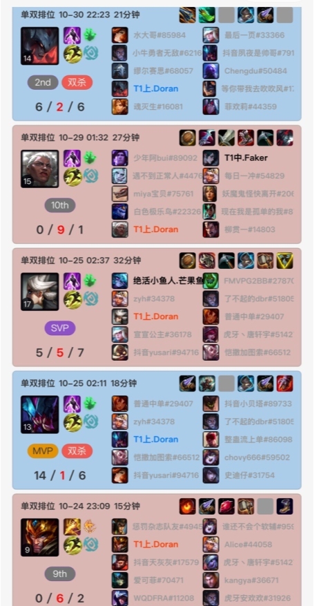 直播吧10月31日讯根据排位统计小程序显示T1上单Doran在峡谷之巅加练,近期两局狼母战绩惨淡,最后用酒桶拿下一把MVP才下线。