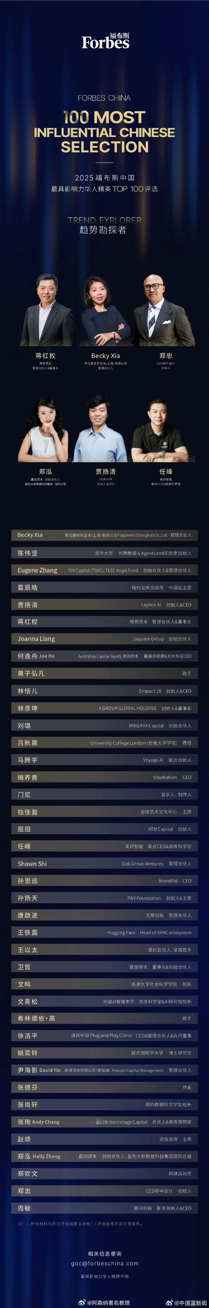郑钦文入选福布斯华人精英榜单 2025年10月30日,2025福布斯中国最具影响力华人精英TOP 100评选结果发布。榜单分“产业重塑者”“价值创造者”“趋势勘探者”三部分。其中“趋势勘探者”有音乐人、运动员等,如黄子弘凡、郑钦文、张德芬