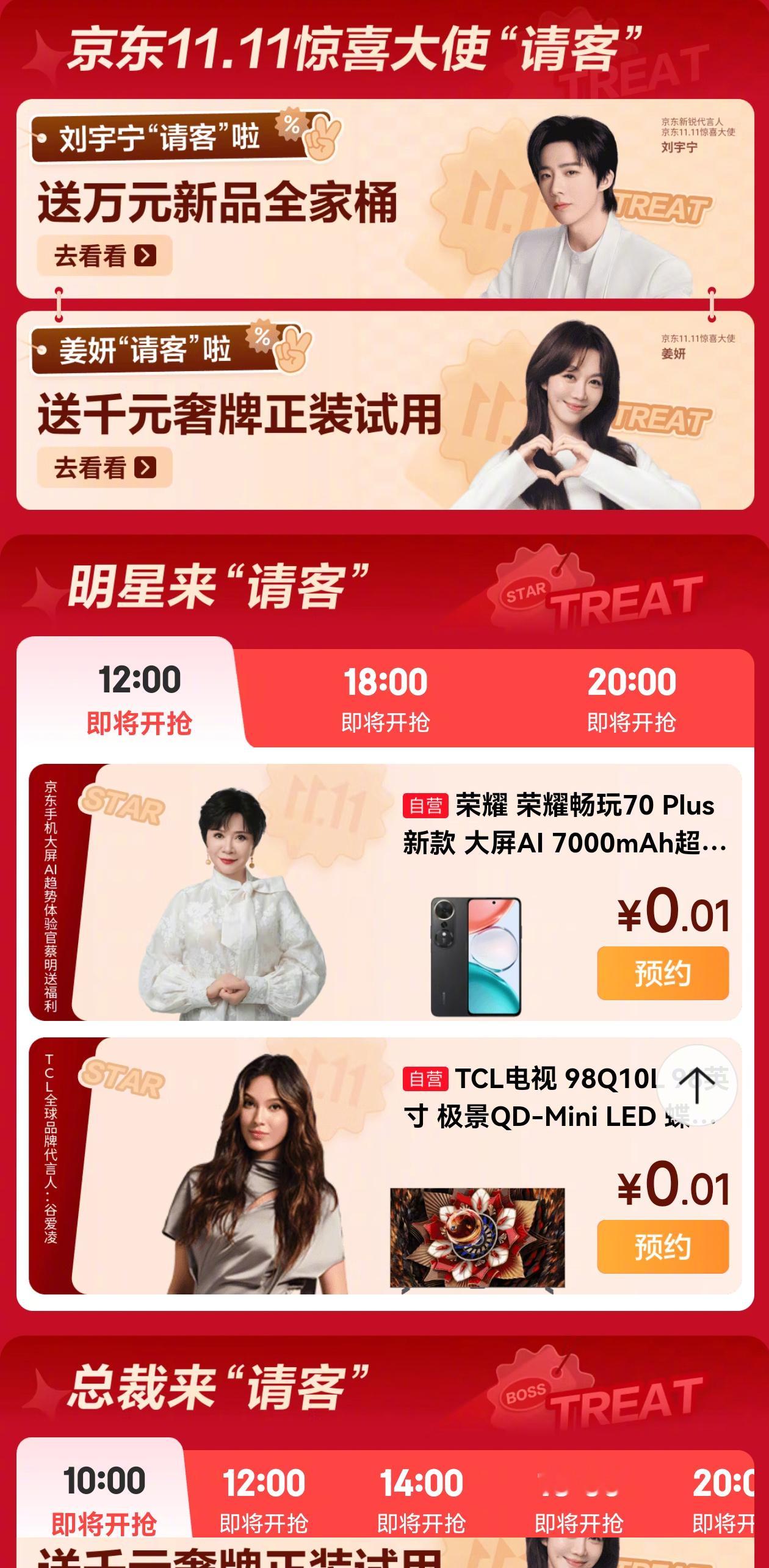 京东请客送炸鸡红酒大闸蟹全体注意!紧急福利预警!京东11.11今日请客!! “请客” 清单 请查收~华凌空调、新飞智能冰箱、圣农炸鸡、元萝卜AI 机器人,闭眼冲都不踩雷!全是1分钱!1分钱领回家!小编已经把闹钟设好了,你们赶紧上京东 App 搜 “京东请客” 预约,手速决定你能不能把这些抱回家,冲就对了!