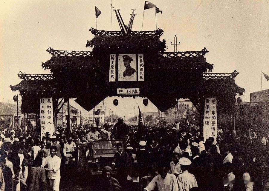 1945年9月3日,国民政府将这一天定为抗战胜利纪念日,在陪都重庆及全国多地举行盛大庆祝活动。画面中心是一座装饰着松柏枝的“胜利门”牌坊,牌坊中央悬挂着常申凯的肖像,两侧配有标语,顶部飘扬着民国旗帜,牌坊下方的“胜利门”三字醒目。街道上人潮涌动,民众、车辆穿梭其中,尽显欢庆氛围。