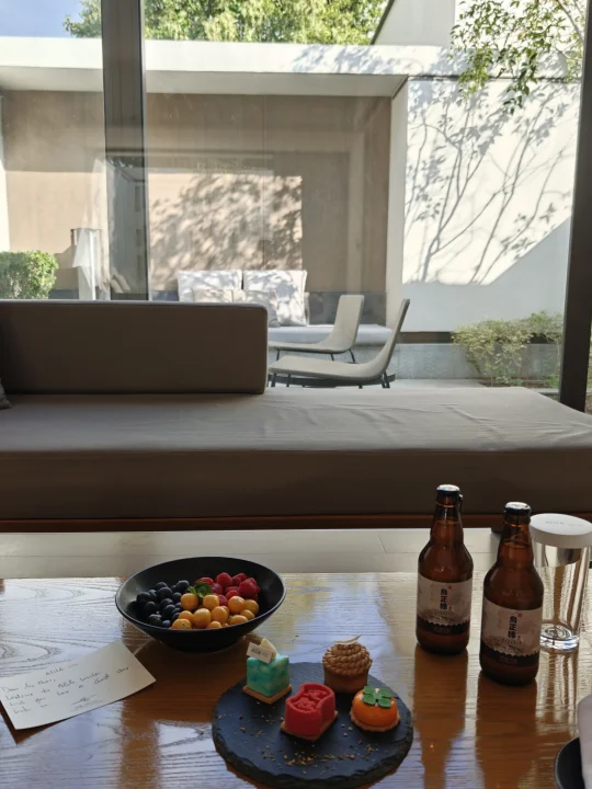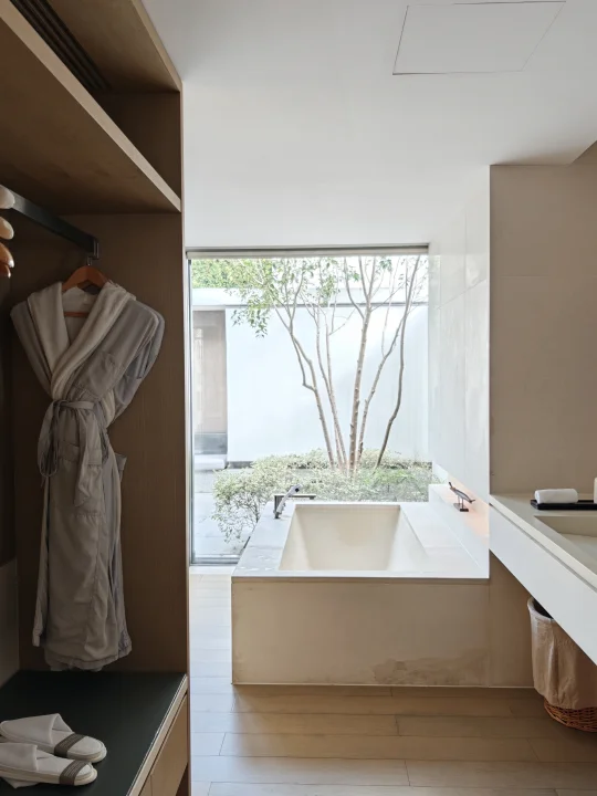 125间独门独院客舍藏在水系里,我住的水舍自带前后双庭院,推开门就是树影波光,随手拍都是光影大片。房间里的浴缸正对庭院,泡浴时用着Alila标配备品,幸福感直接拉满!