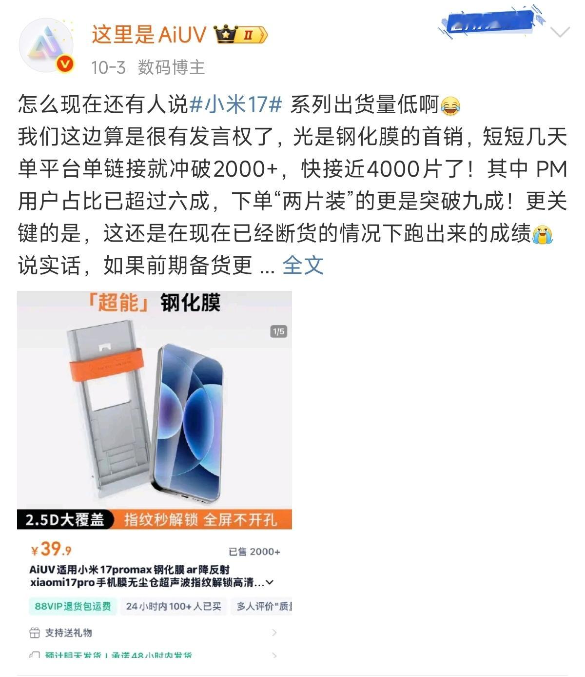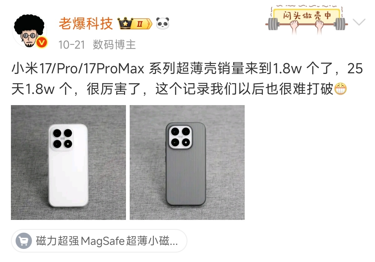 卢伟冰回应手机壳卖家感谢小米之前就说过,小米17系列就是现象级爆品。而且不仅手机卖的好,优秀的第三方壳膜生产商都创下了全新的记录。