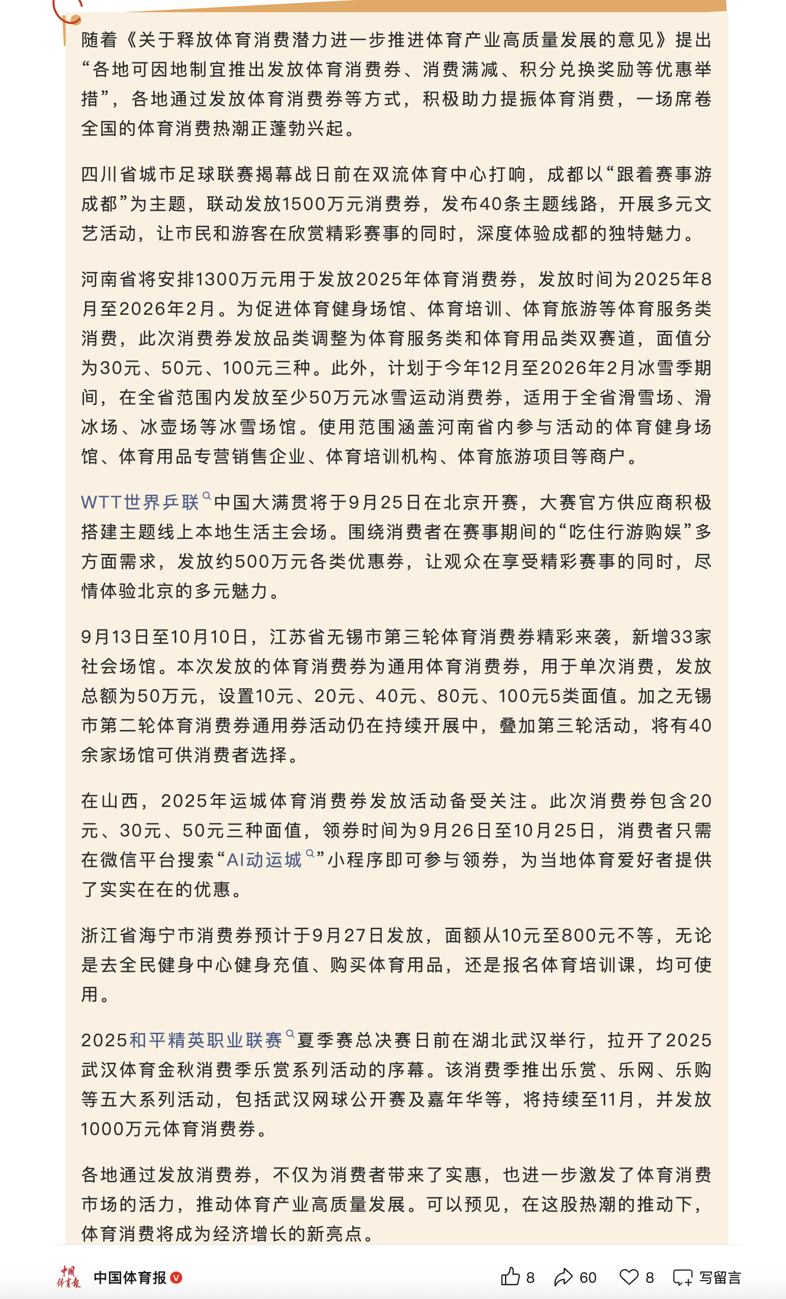 看比赛也能领国家补贴了为带动全民健身热潮,国家和地方纷纷推出体育消费券、公益补贴等激励措施,鼓励大众积极参与体育锻炼。近期,不少城市通过线上平台发放体育消费券,涵盖健身、游泳、球类等多种项目,实实在在降低了民众参与门槛。体育消费不仅是健康投资,更是生活方式的转变。既省钱又提升了运动技能,还结识了不少志同道合的朋友,真正感受到运动带来的快乐与活力。