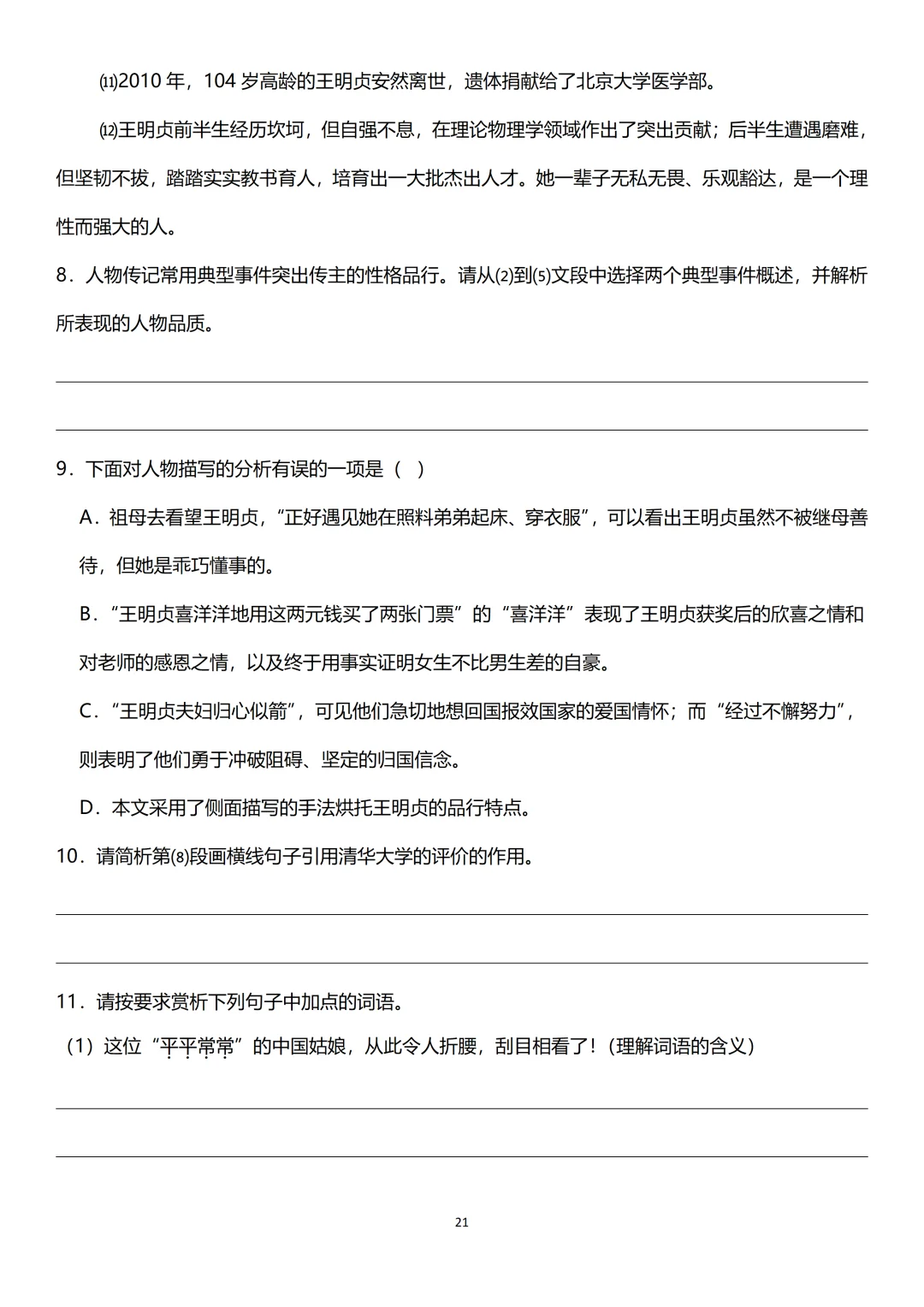 三、人物形象概括与分析题要结合情节/细节来分析[耶R]