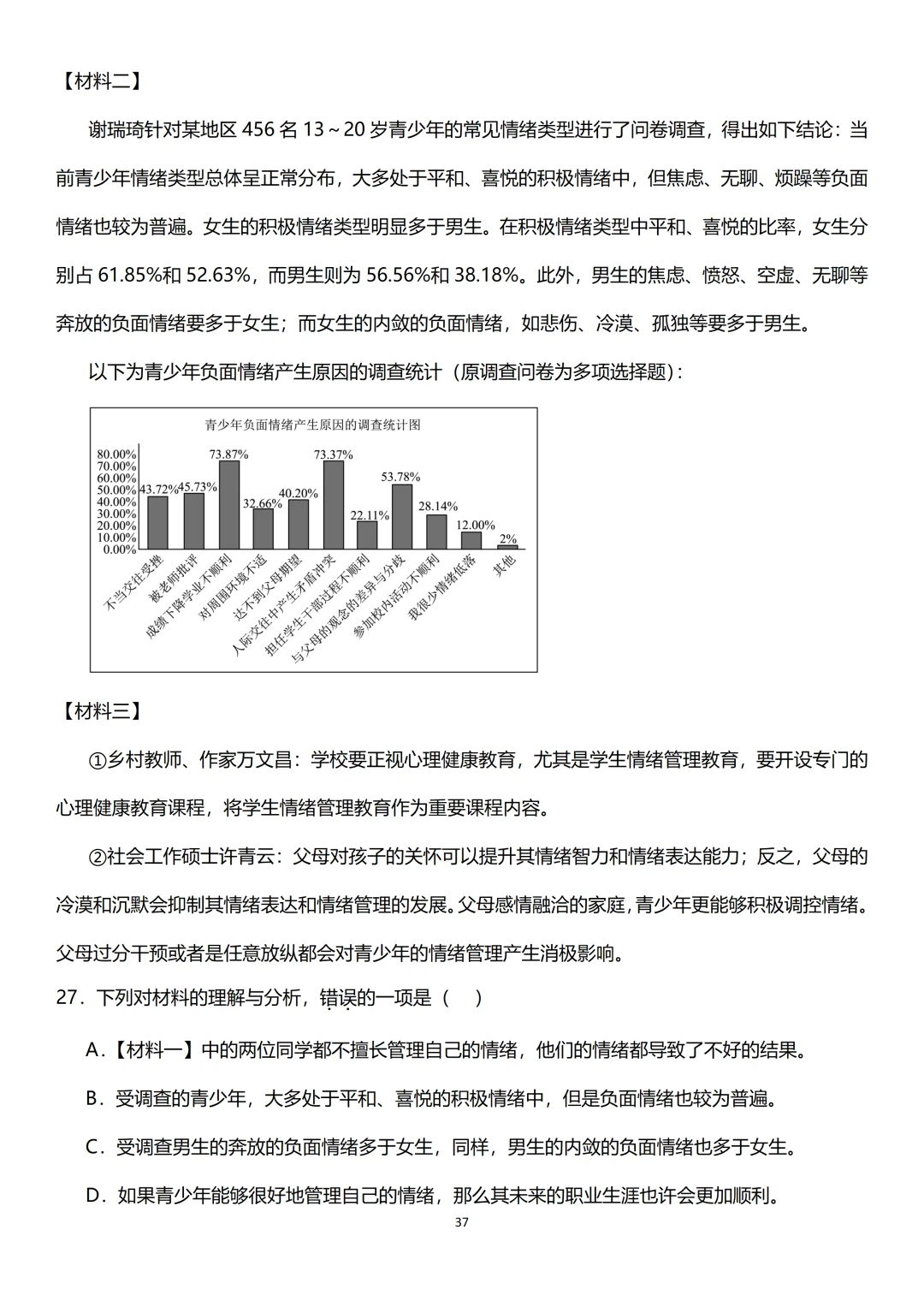 一、文字类材料:关注材料的标题、中心句、关键句、总结句、限定词等关键词句,分析材料中作者所表达的态度、观点或揭示的主要问题。