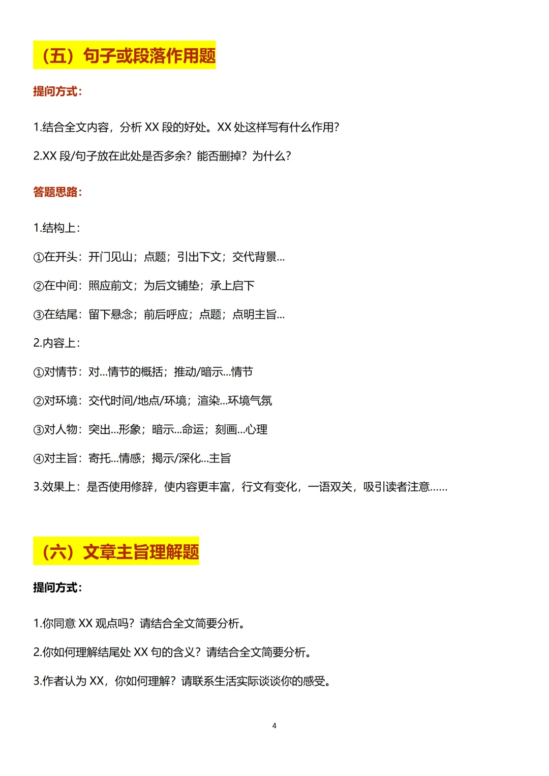 结构上(开头/中间/结尾有什么作用),内容上(①对情节②对环境③对人物④对主旨),效果上(是否使用修辞,使内容更丰富,行文有变化,一语双关等等)