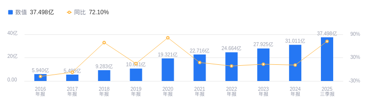 2025年三季度,康达新材营业收入达37.5亿元,行业排名第2/5,高于行业平均数25.93亿元和中位数15.39亿元,行业第一名永冠新材为50.03亿元。当期净利润为7526.62万元,行业排名第3/5,行业平均数为8101.19万元,中位数为7526.62万元,行业第一名聚胶股份为1.41亿元,第二名永冠新材为1.12亿元。