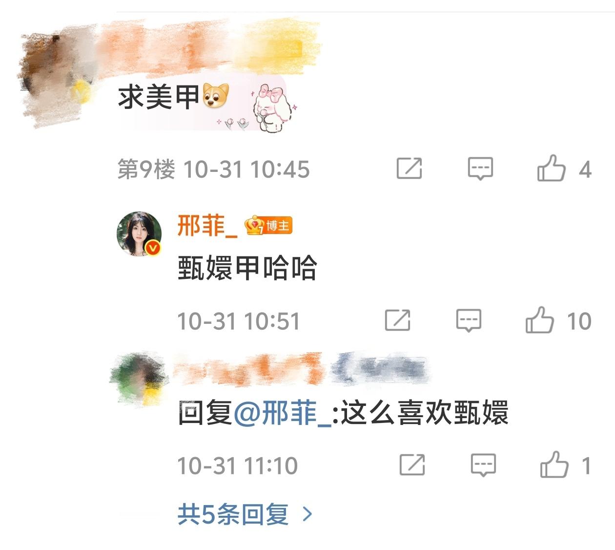 邢菲做了甄嬛同款美甲 预感这个甲要火,邢菲回复粉丝自己新作的指甲叫甄嬛甲,搜了一
