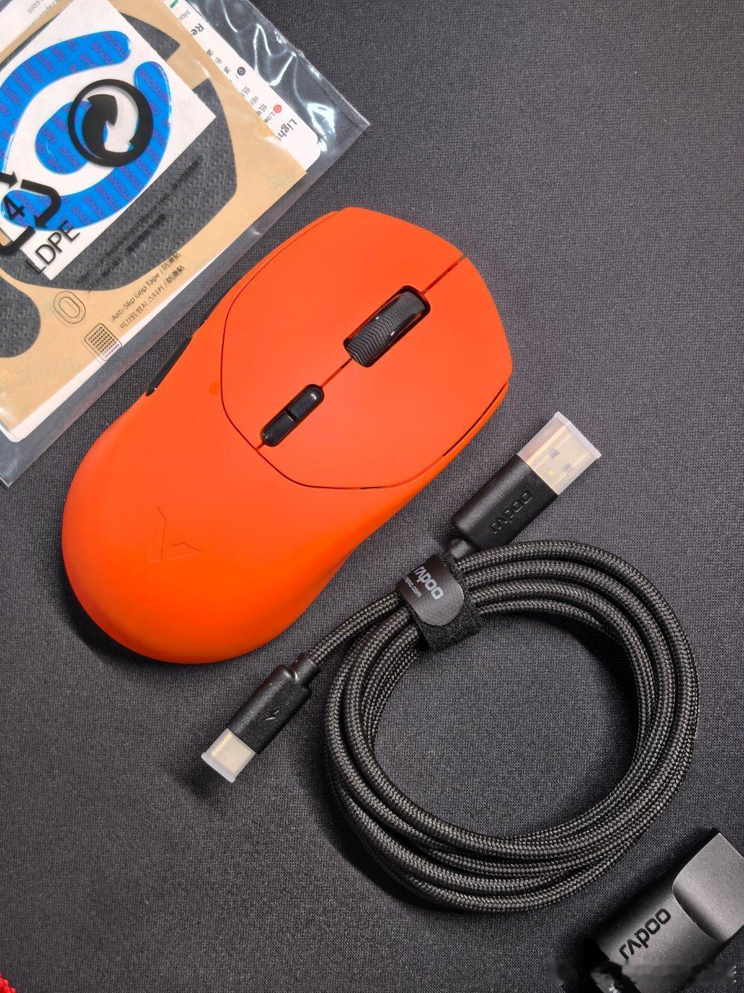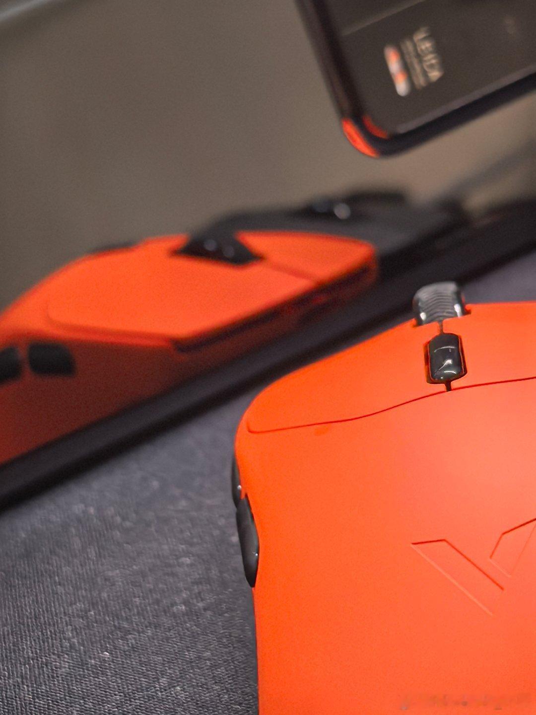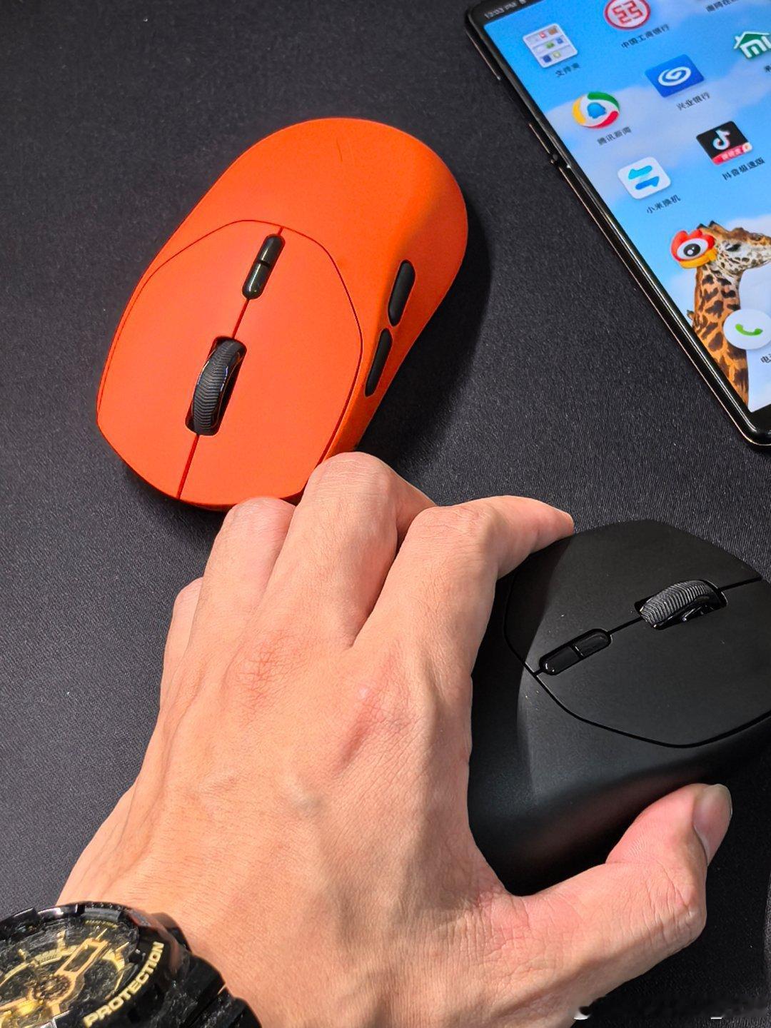 黑色的是VT1,橙色的是VT1 Max,两款整体都偏轻盈,49±3g的设计,右手对称款设计,底部设计了磁吸收纳仓,尺寸无差别,适合中小手型,不挑手型,带DPI快捷键。