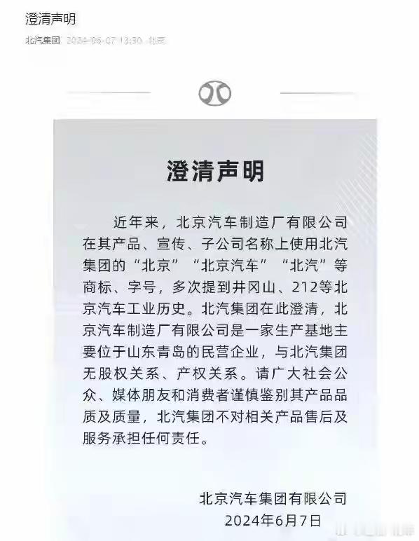 北汽集团在澄清212爬坡翻车时表示,近年来,北京汽车制造厂有限公司在其产品、宣传、子公司名称上使用北汽集团的“北京”“北京汽车”“北汽”等商标、字号,多次提到井冈山、212等北京汽车工业历史。北汽集团在此澄清,北京汽车制造厂有限公司是一家生产基地主要位于山东青岛的民营企业,与北汽集团无股权关系、产权关系。请广大社会公众、媒体朋友和消费者谨慎鉴别其产品品质及质量,北汽集团不对相关产品售后及服务承担任何责任。