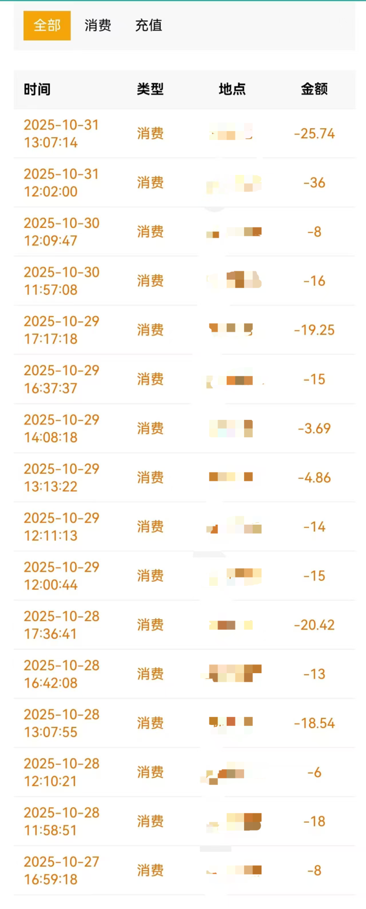 就拿10月28日这天来说,孩子先在食堂消费了一笔18元的午餐,吃完又去烧饼摊买了一个6块钱的烧饼。过了一个小时,他又出现在小卖部消费了一笔零食。当天晚餐在食堂吃完13元的晚餐,又去学校小卖部消费了20元的零食。