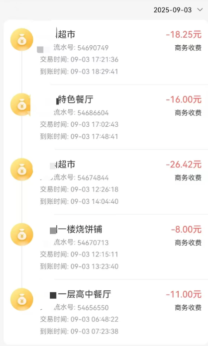 一位家长说:“这个反差主要来自于初中和高中的区别。比如初中中饭15元,晚餐20元,钱都是一学期一次性交给学校的,孩子有啥吃啥。到了高中,孩子脱离家长开始住校了,每一餐吃什么,花多少,决定权都在自己手里。还没赚钱就突然获得了财富自由,那必须要刷个痛快了。”