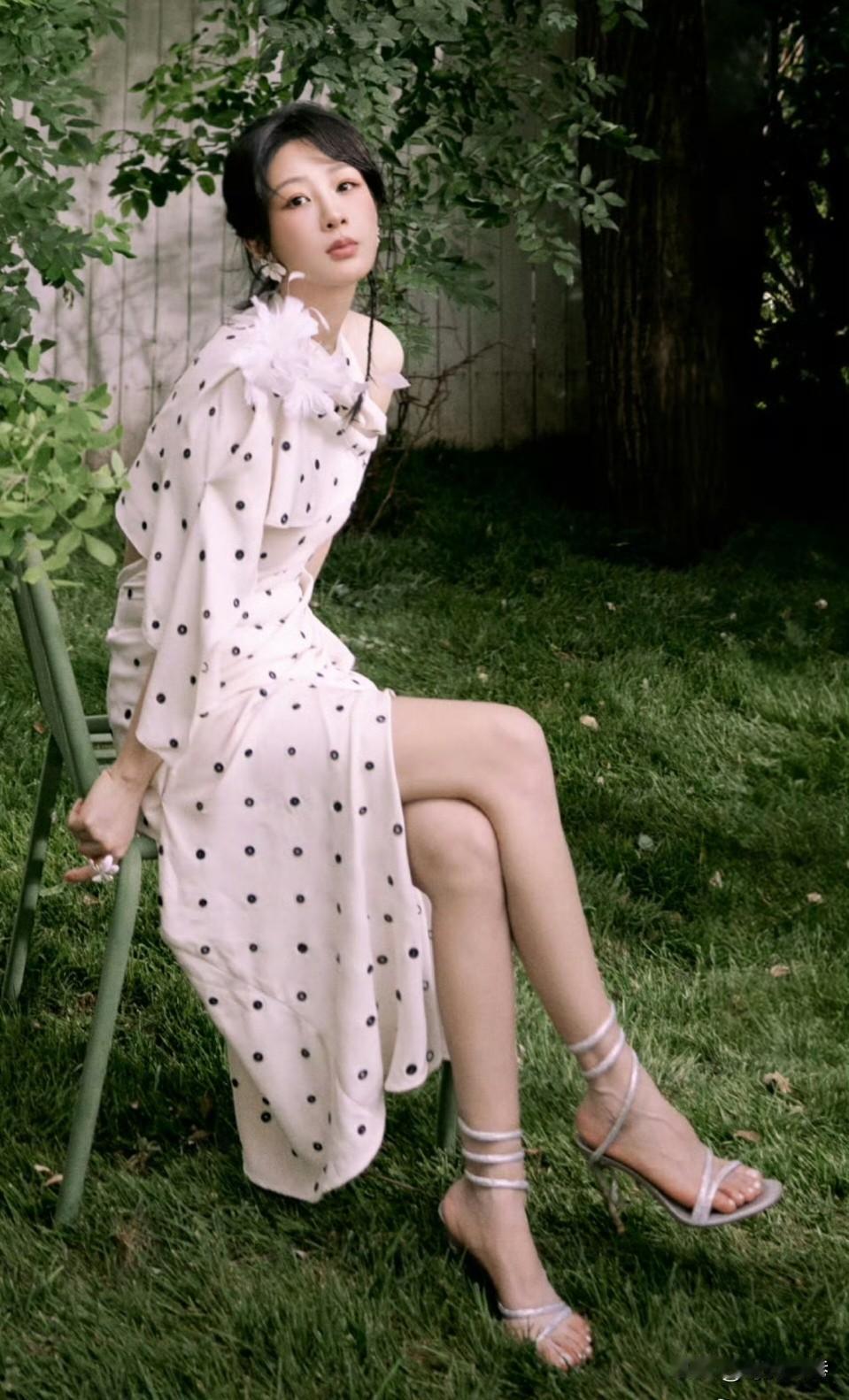 身穿白色圆点高开叉长裙的杨紫,就一个字形容,美!