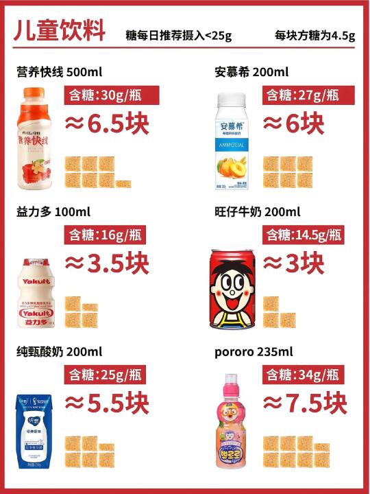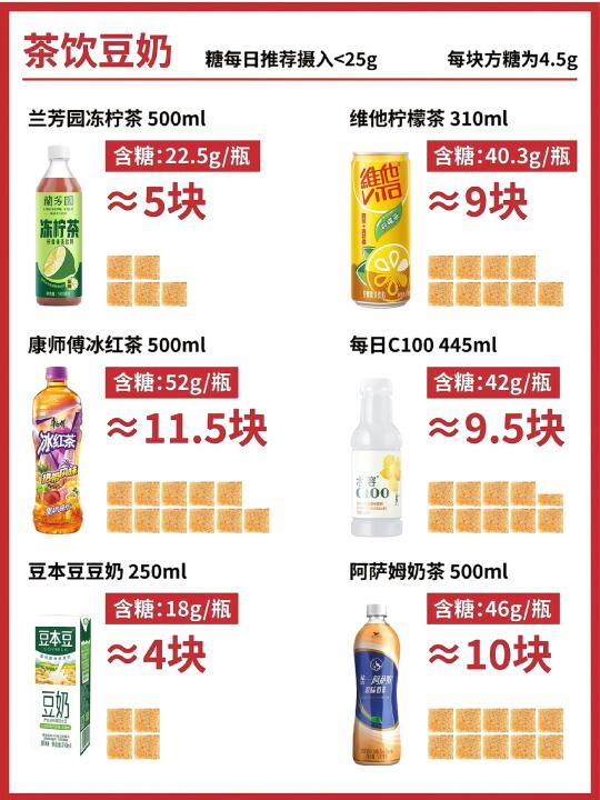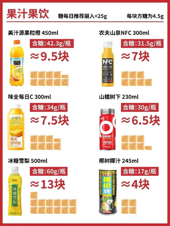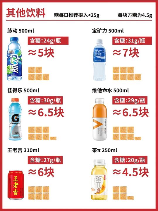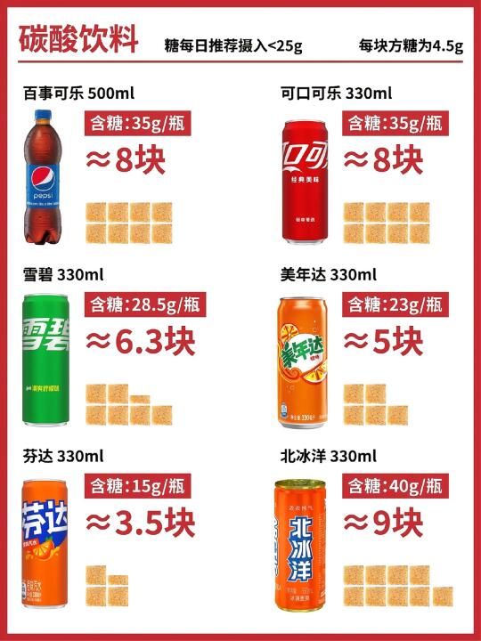 看看这些常见饮料,一瓶可乐35g糖 🍬 相当于8块方糖,妥妥超过每日推荐量(25g内)!美汁源果粒橙、北冰洋…有的一瓶含糖量直接让一天糖分超标,正餐+水果再一搭,轻松破百克💥 多余糖可都变成脂肪囤着,体重秤要哭死😭