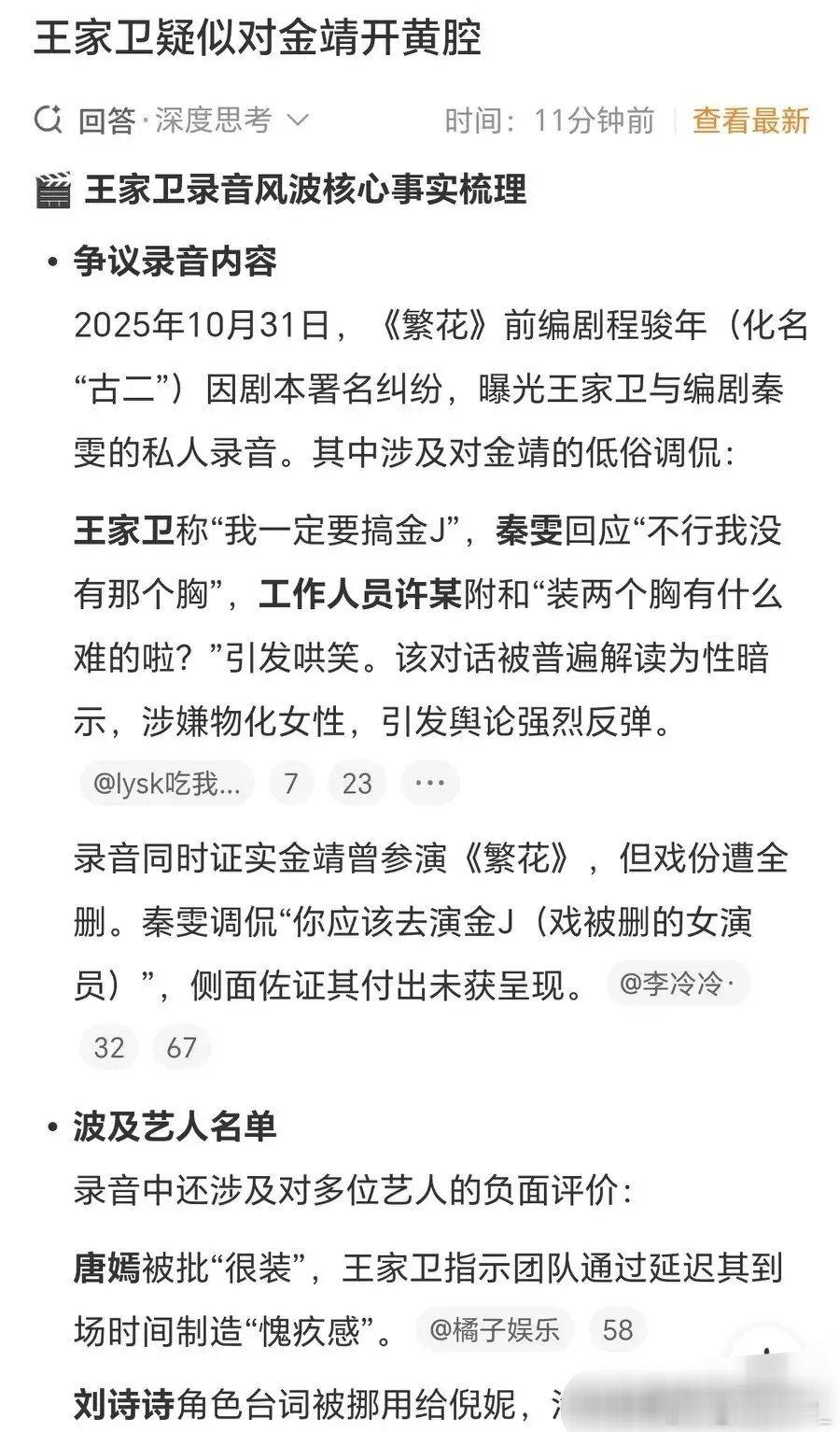 《繁花》前编剧因纠纷曝光王家卫私人对话录音!不仅涉及唐嫣会装还疑似对金靖开黄腔,还有对游本昌、陈道明、刘诗诗的背后吐槽。