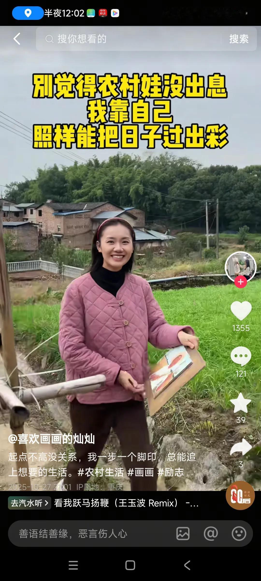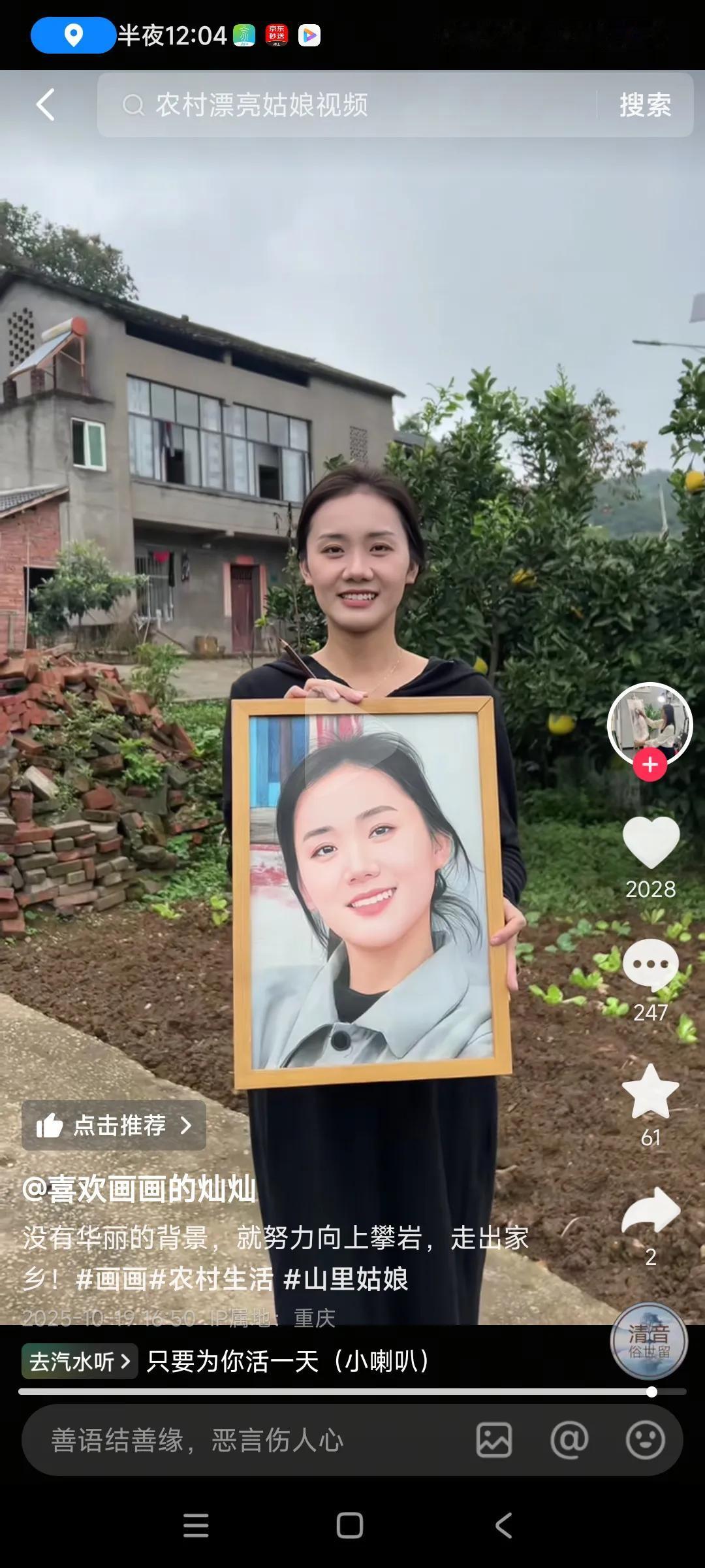 关注这个女画家好久了,听说是98年的,很年轻,在乡村生活,房子有些旧,每天高高兴兴的,是个阳光女孩。 室雅何须大,花香不在多,她靠画画创出一片天地,又是她的爱好,还能养活自己,家人,比我们委屈求全,寄人篱下在外面漂泊,打工强多了,,,她这个属于靠本事吃饭,属于稀世珍宝,很少有人竞争的,,非常佩服她,,,