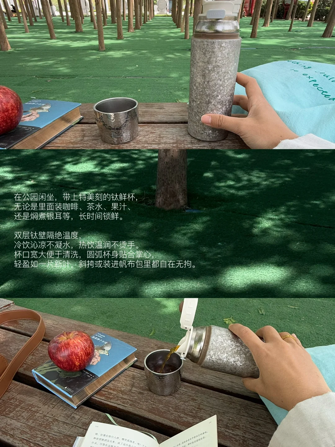 在公园闲坐,带上特美刻的钛鲜杯,无论是里面装咖啡、茶水、果汁、还是焖煮银耳等,长时间锁鲜。双层钛壁隔绝温度,冷饮沁凉不凝水,热饮温润不烫手。杯口宽大便于清洗,圆弧杯身贴合掌心,轻盈如一片新叶,斜挎或装进帆布包里都自在无拘。