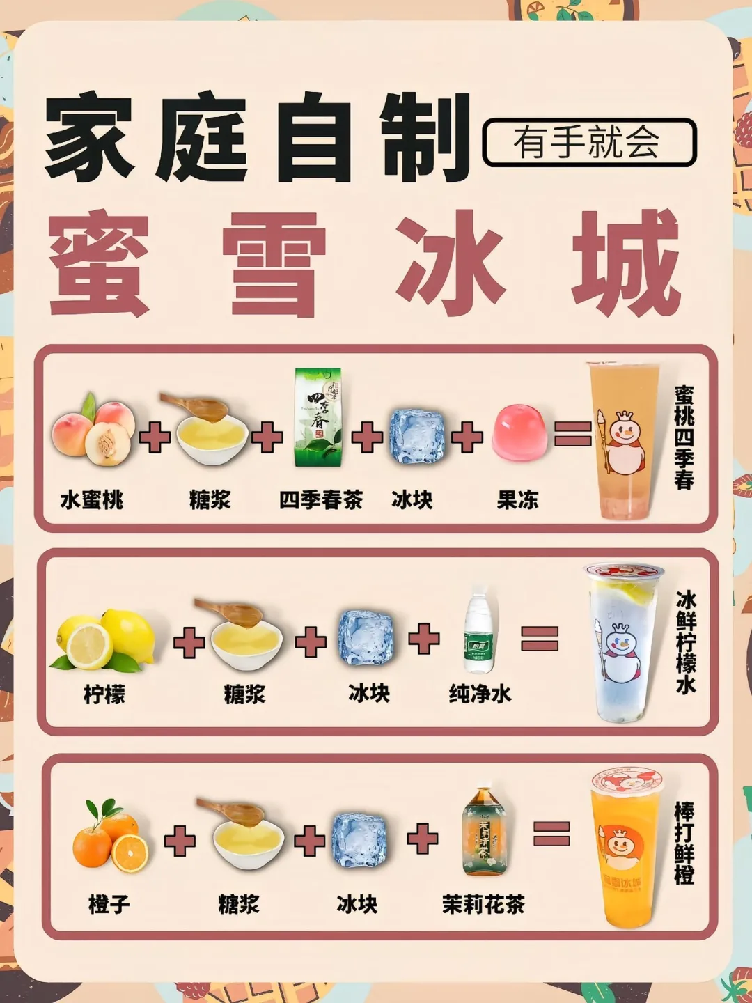 1. 蜜桃四季春🍑:水蜜桃+糖浆+四季春茶+果冻+冰块!一口下去桃香爆炸~