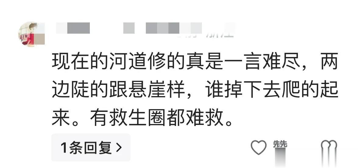 现在的河道修的是好看,平平整整的,可两边陡的跟悬崖似的,谁掉下去爬的上来呀?