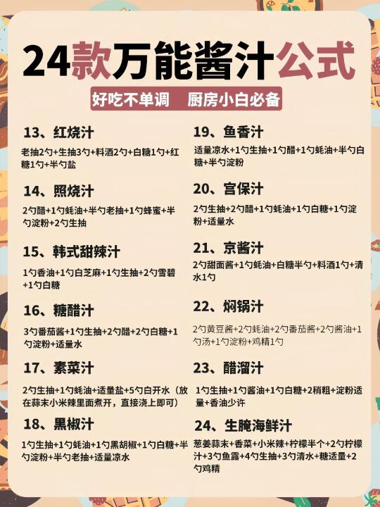 厨房小白想秒变料理达人?💥这 24 款万能酱汁公式赶紧码住!有了它们,做菜好吃到开挂,再也不用纠结调味啦~