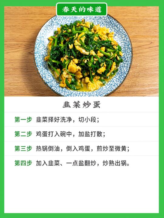 • 韭菜炒蛋:韭菜和鸡蛋简直是天生一对!简单几步,韭菜的清香和鸡蛋的嫩滑完美融合,一口下去,满满的春天滋味~