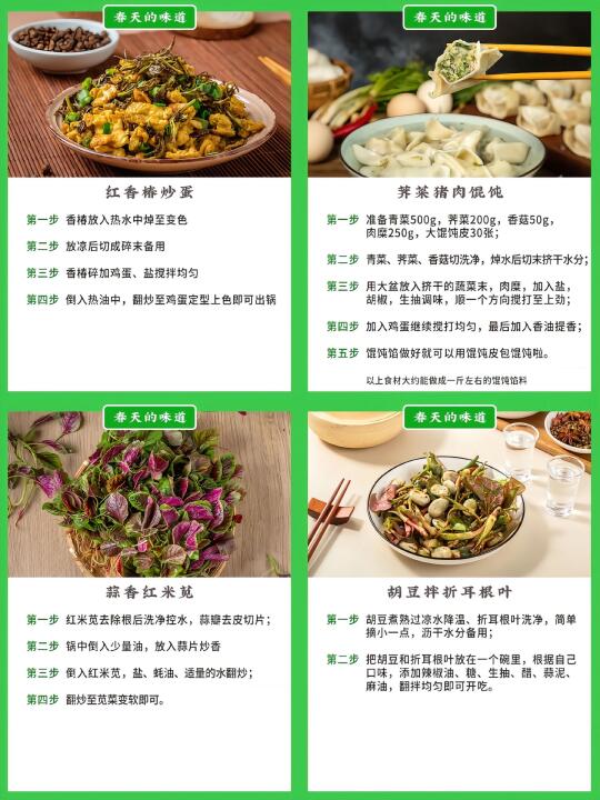 还有红香椿炒蛋、荠菜猪肉馄饨、蒜香红米苋、胡豆拌折耳根叶,每一道都能让你把春天吃进肚子里~