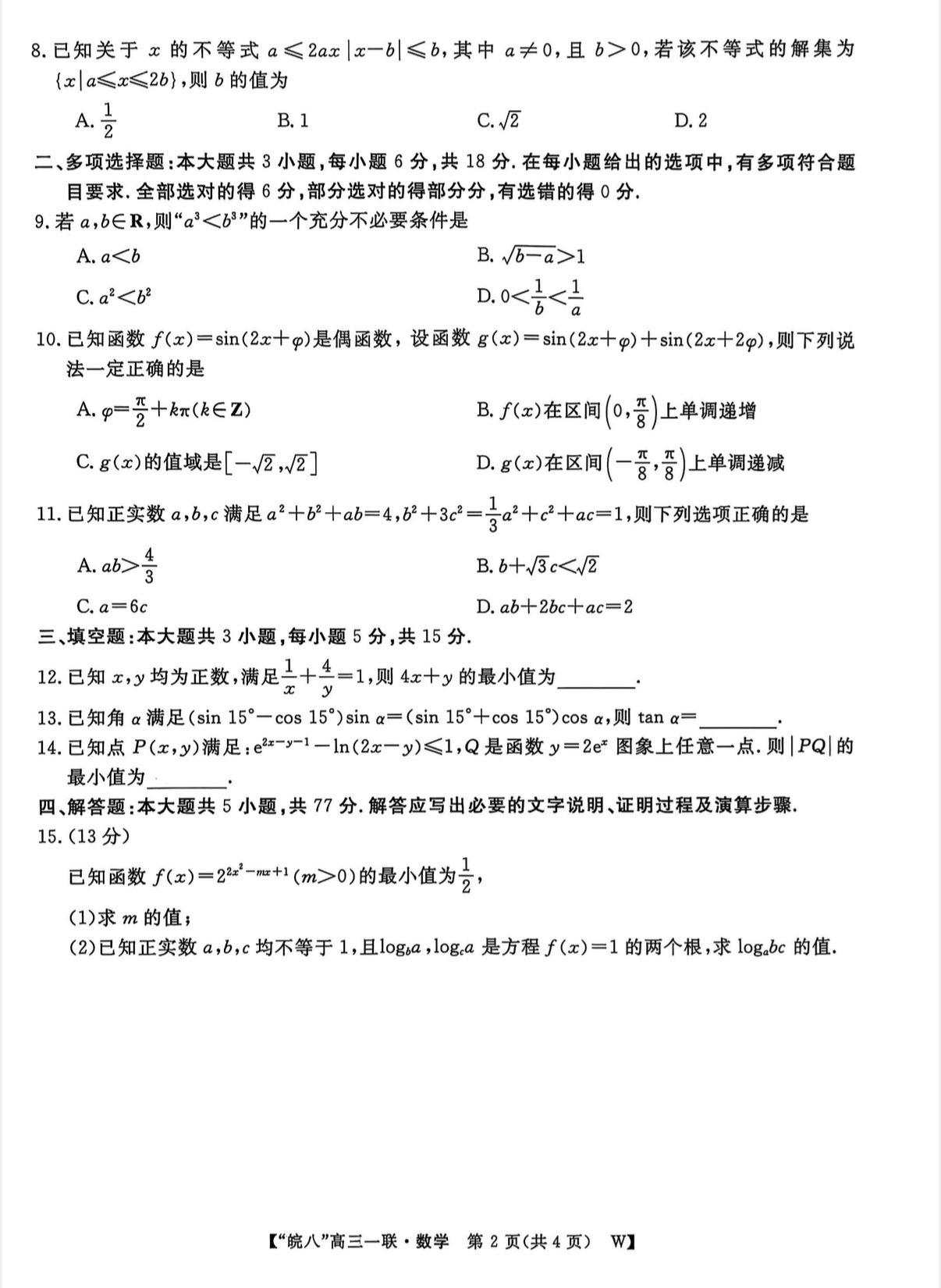 安徽省皖南八校2026届高三第一次联考数学试卷及答案,因为一轮复习没结...