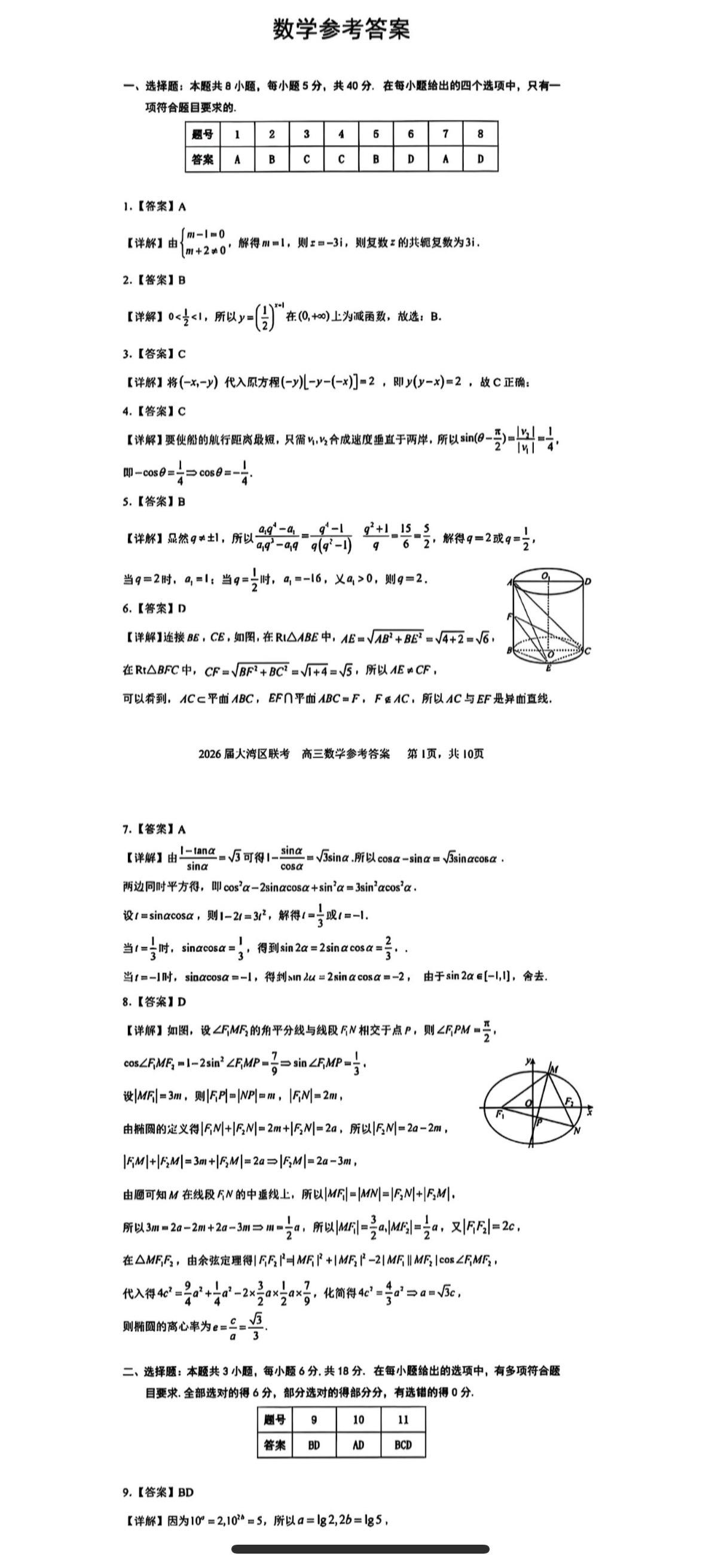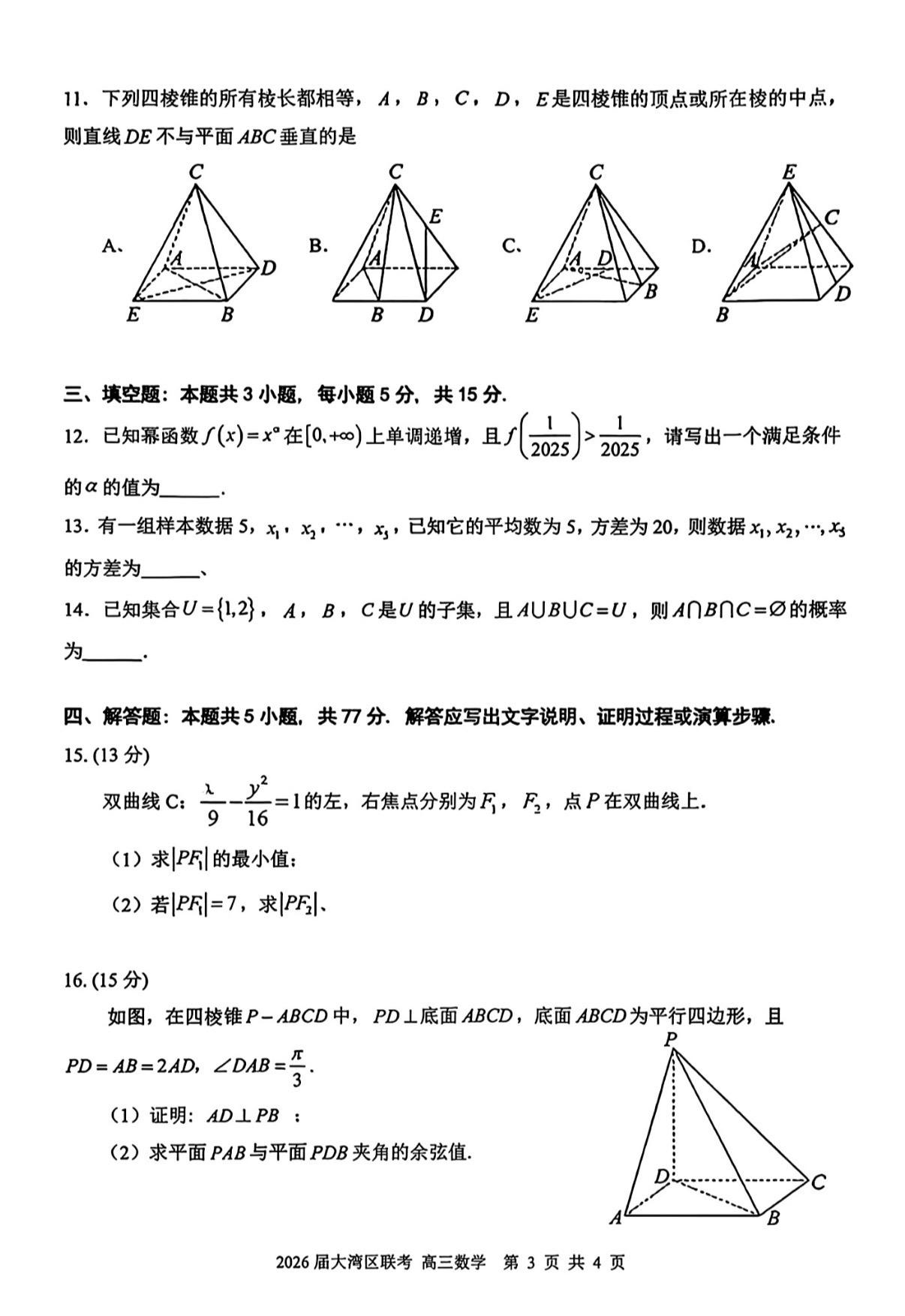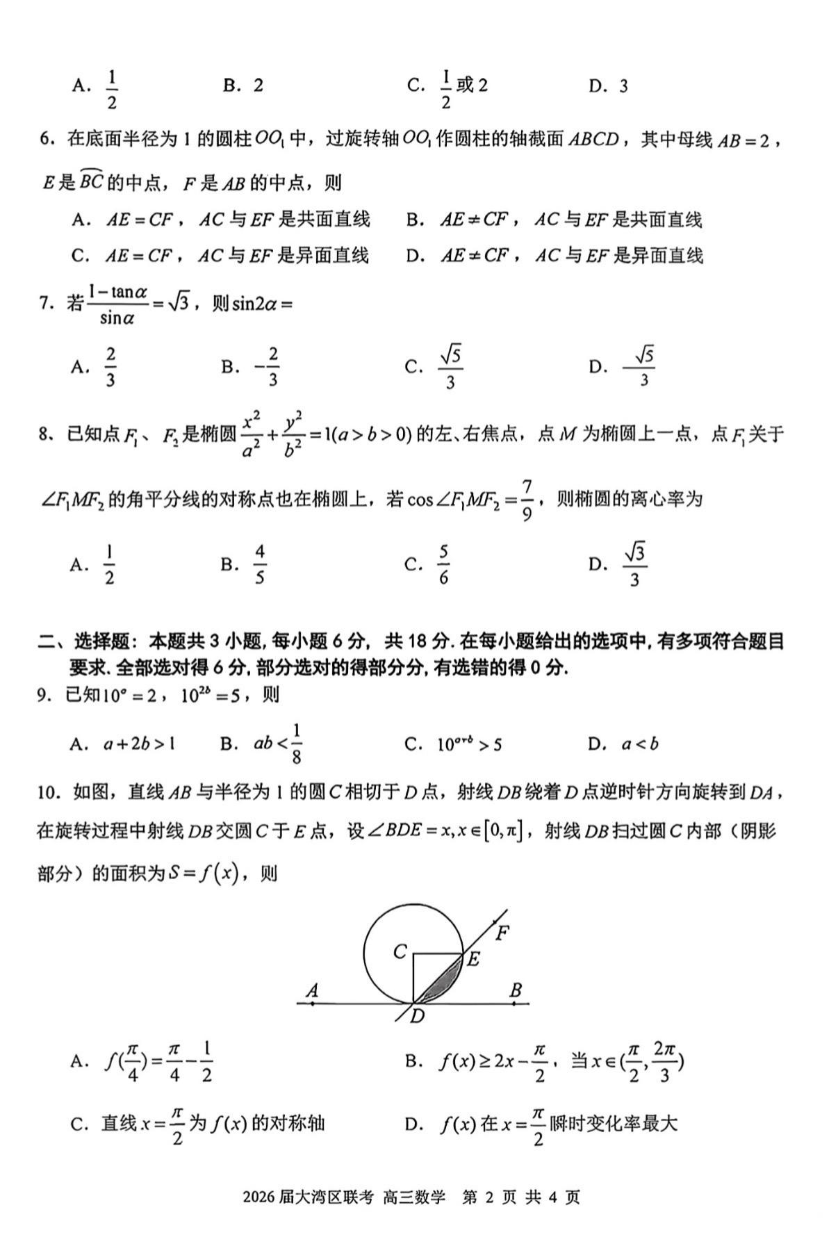 广东大湾区2026届高三第一次联考数学试题,质量不错,难度与真题接近!...