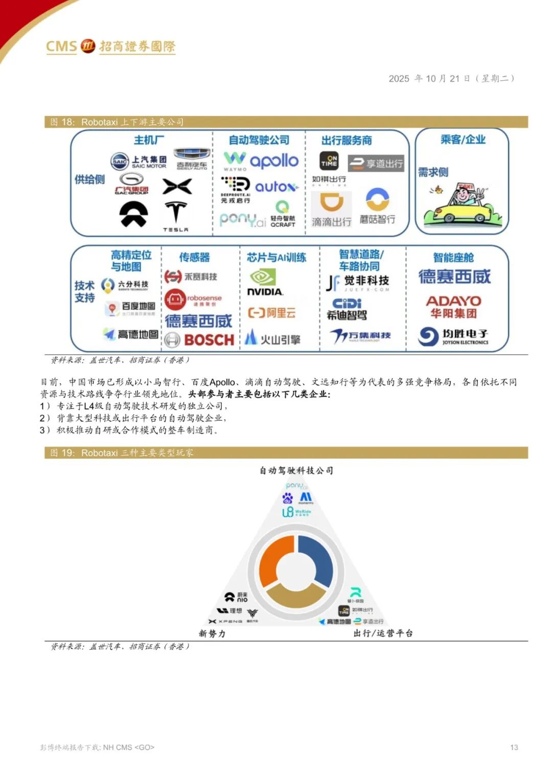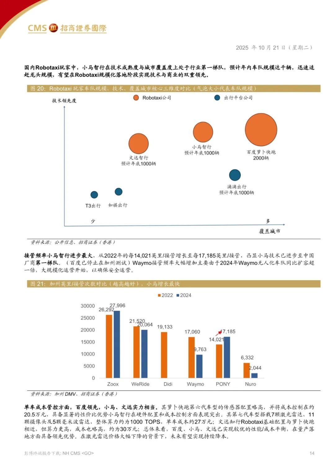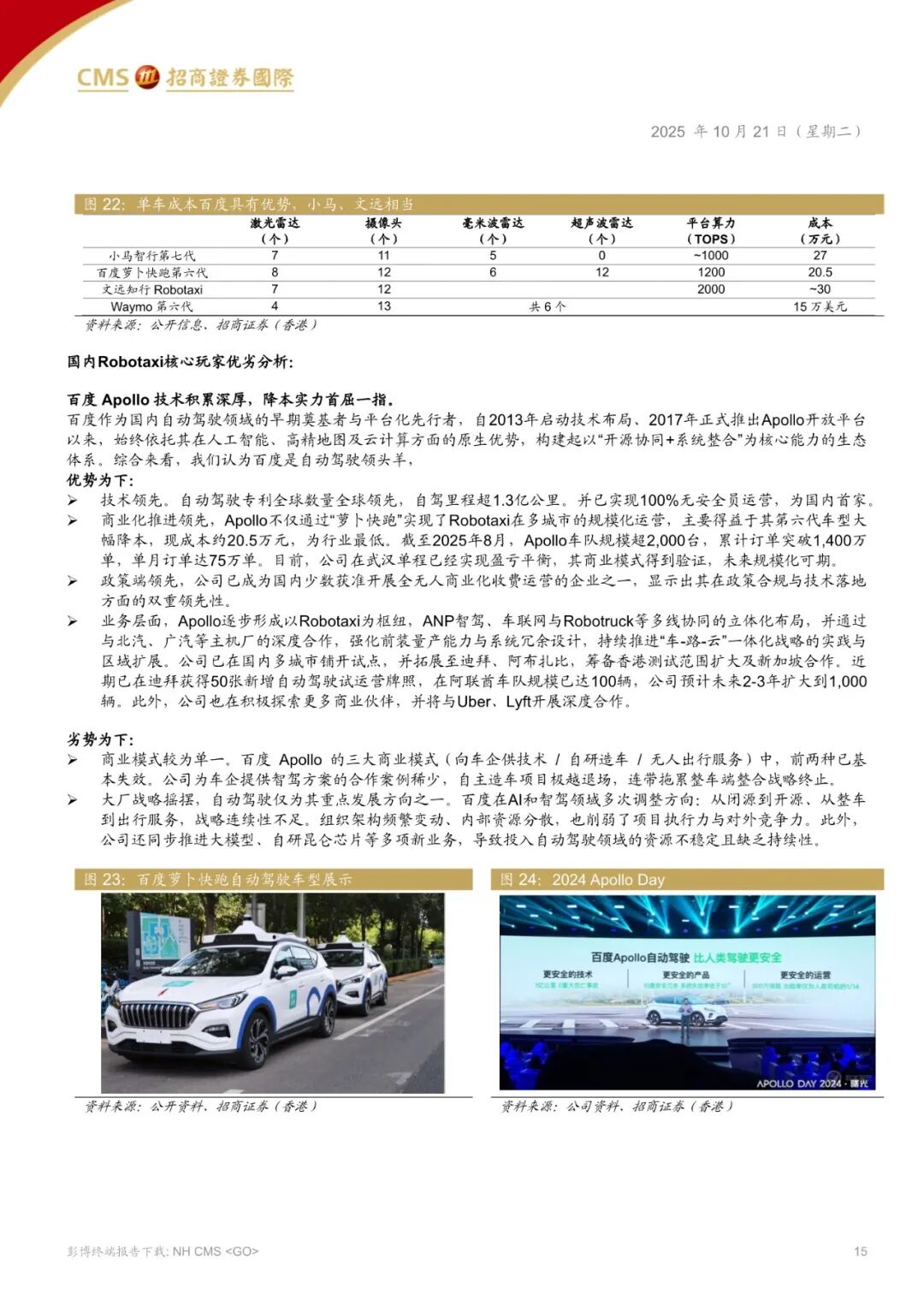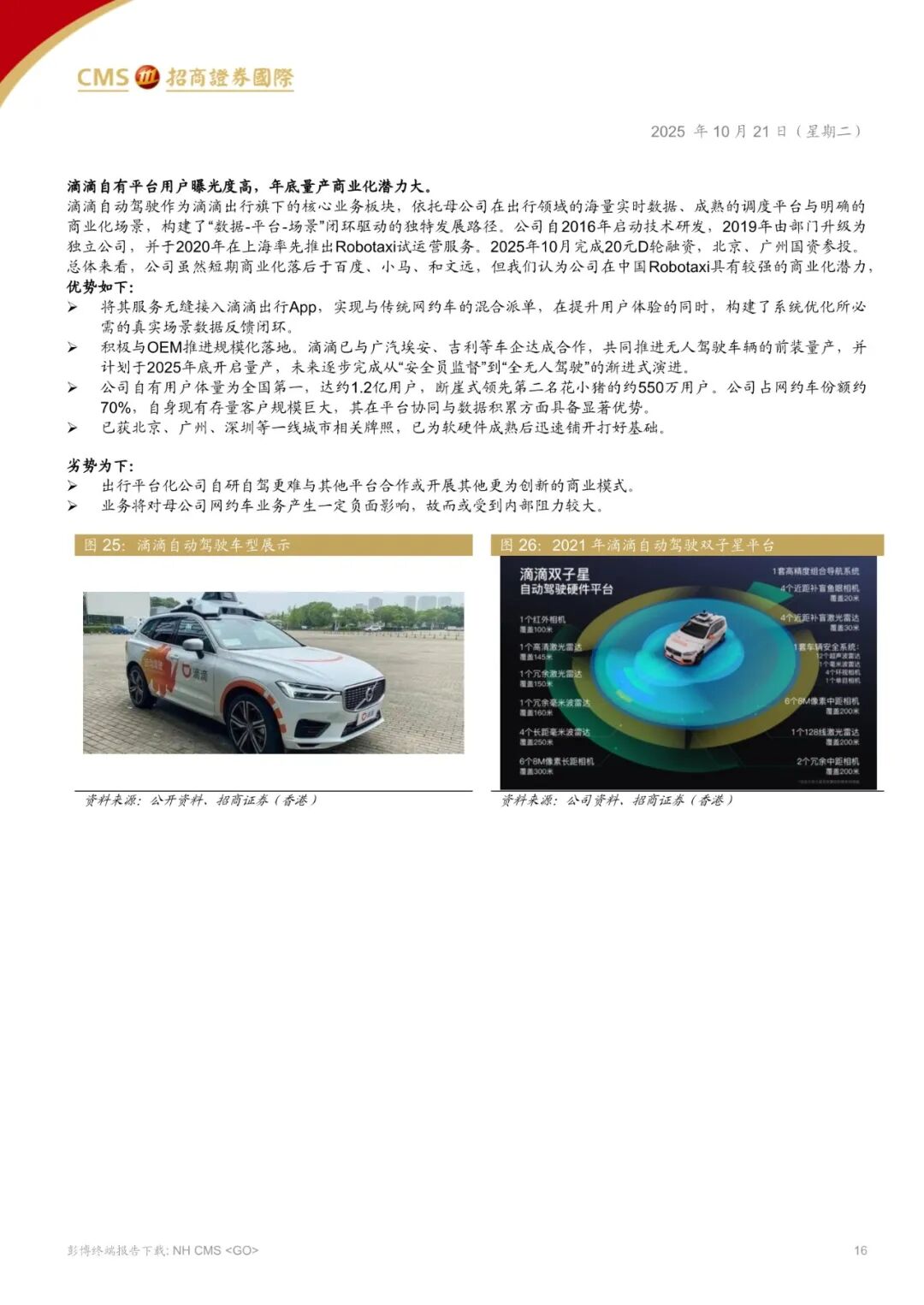 小马智行成立于2016年,由彭军与楼天城联合创立,是中国最早实现全无人驾驶收费运营的自动驾驶公司。公司以自研PonyWorld仿真系统+端到端AI框架为核心,形成闭环训练体系。虚拟司机平台实现算法、域控制器、仿真系统全栈打通,平衡安全性与成本。AI模型快速迭代推动感知、预测、规划性能持续优化,构筑深厚护城河。在Robotaxi领域,和OEM合作量产降本快,并与平台合作增强流量。公司第七代车型成本较前代下降70%,设计寿命达10年/60万公里,与丰田、广汽等合作加速量产。且目前已在北上广深四城获得Robotaxi商业化许可,覆盖城市仅次于萝卜快跑。2025年上半年公司Robotaxi乘客收入同比增长300%,注册用户数增长136%,车队规模突破500台,预计年底达1,000台,率先迈入Robotaxi规模化盈利前夜。Robotruck领域,虽短期收入将保持稳定,但未来Robotaxi技术成熟后可以低成本迅速地复制到Robotruck业务,开启第二成长曲线。