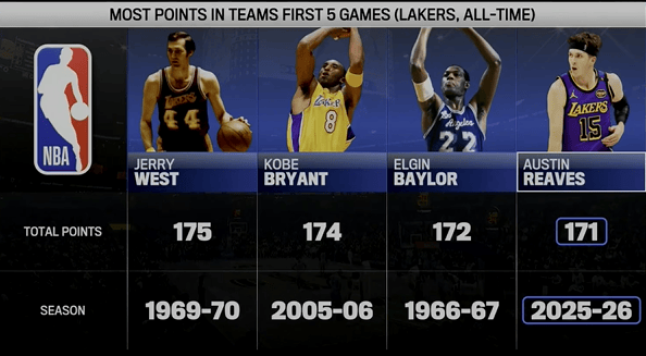 里夫斯赛季前5场总共得到171分,湖人队史排名第四&韦斯特175分第一。