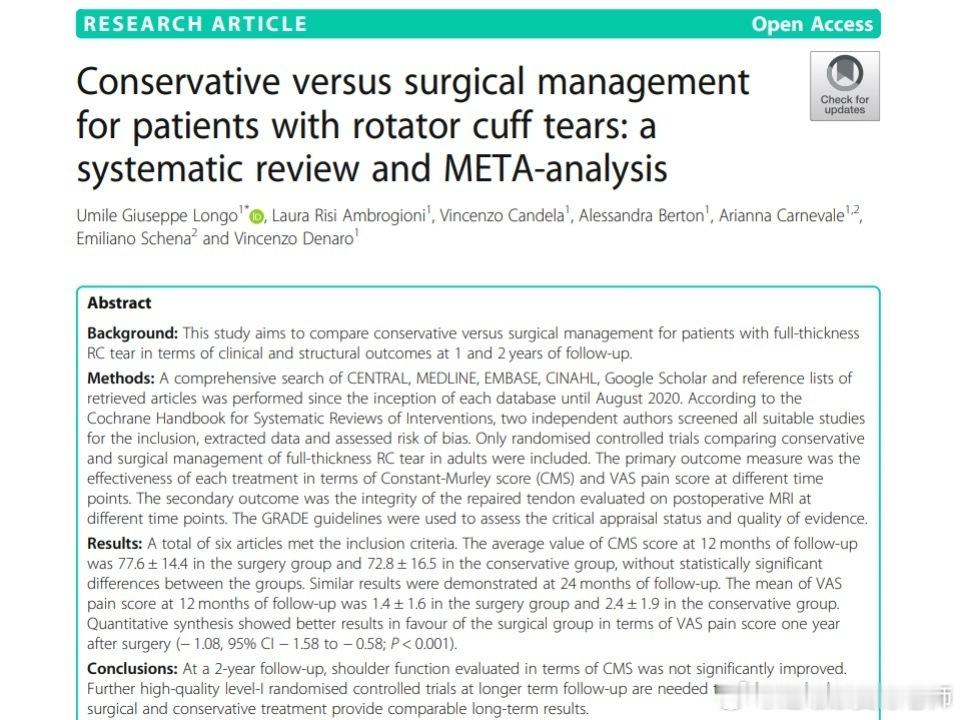 《肩袖撕裂患者的保守治疗与手术治疗:系统评价和META分析》通过系统评价和META分析发现,对于全层撕裂的患者,尽管保守治疗在短期内能缓解疼痛和改善功能,但长期随访结果显示,手术治疗在VAS疼痛评分上优于保守治疗。