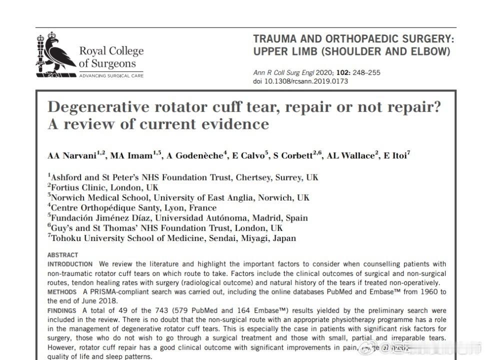 《退行性肩袖撕裂、修复还是不修复?对当前证据的回顾》指出,对于严重的、影响生活质量的全层撕裂,手术治疗通常能获得更好的临床效果和生活质量提升。