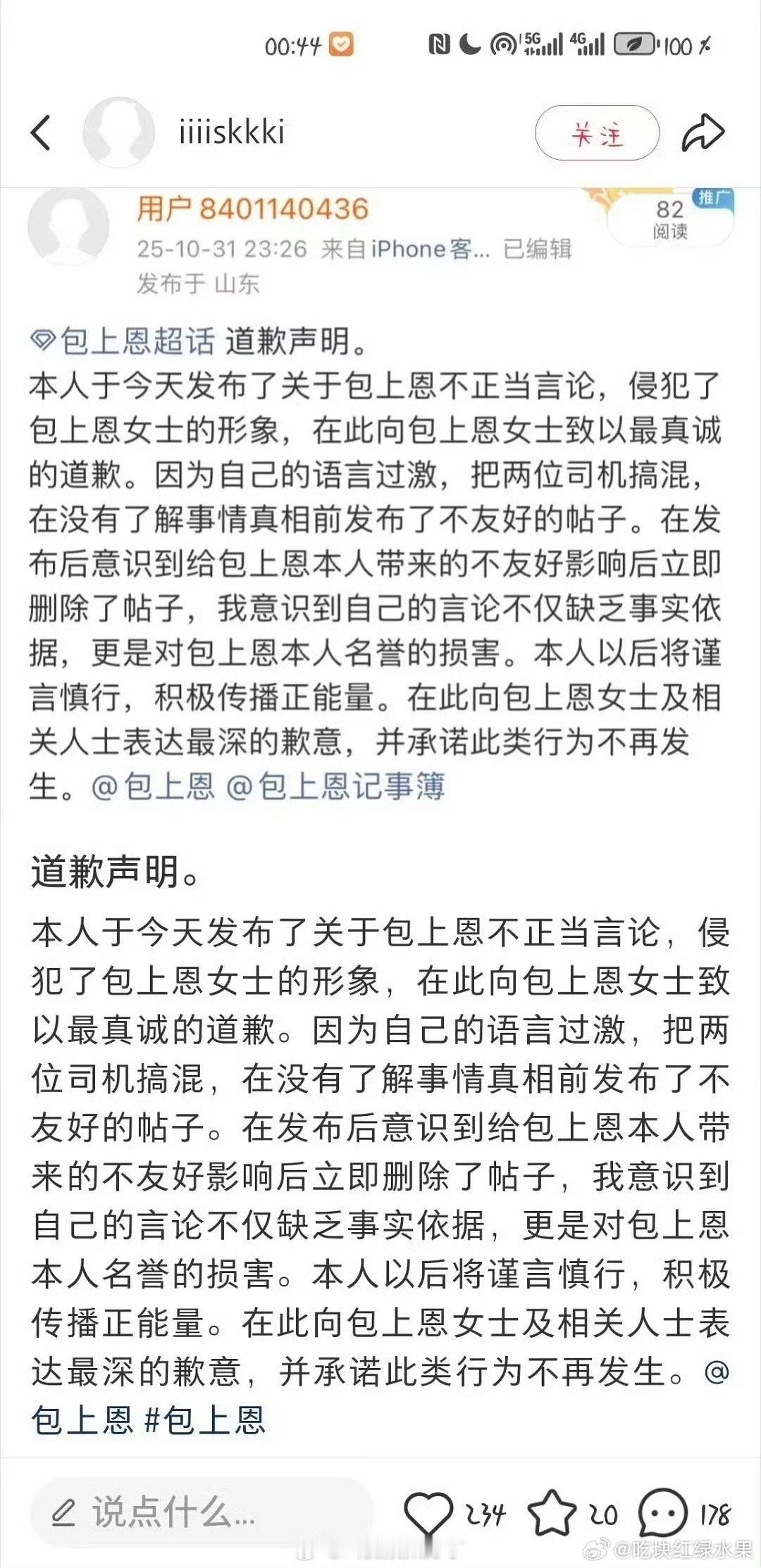 之前力挺包上恩司机的粉丝道歉了 称是把司机搞混了包上恩工作室再回应 包上恩更新i