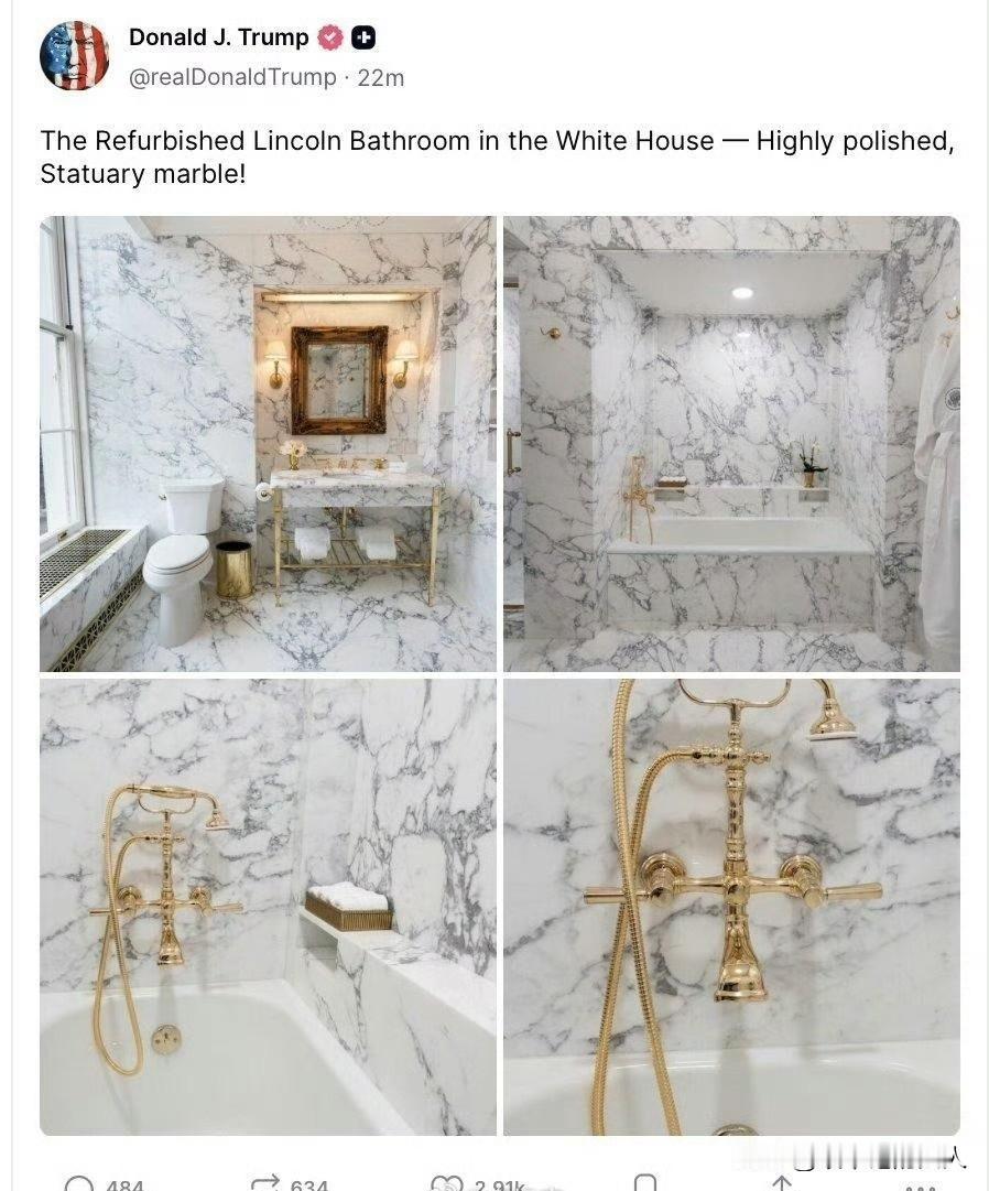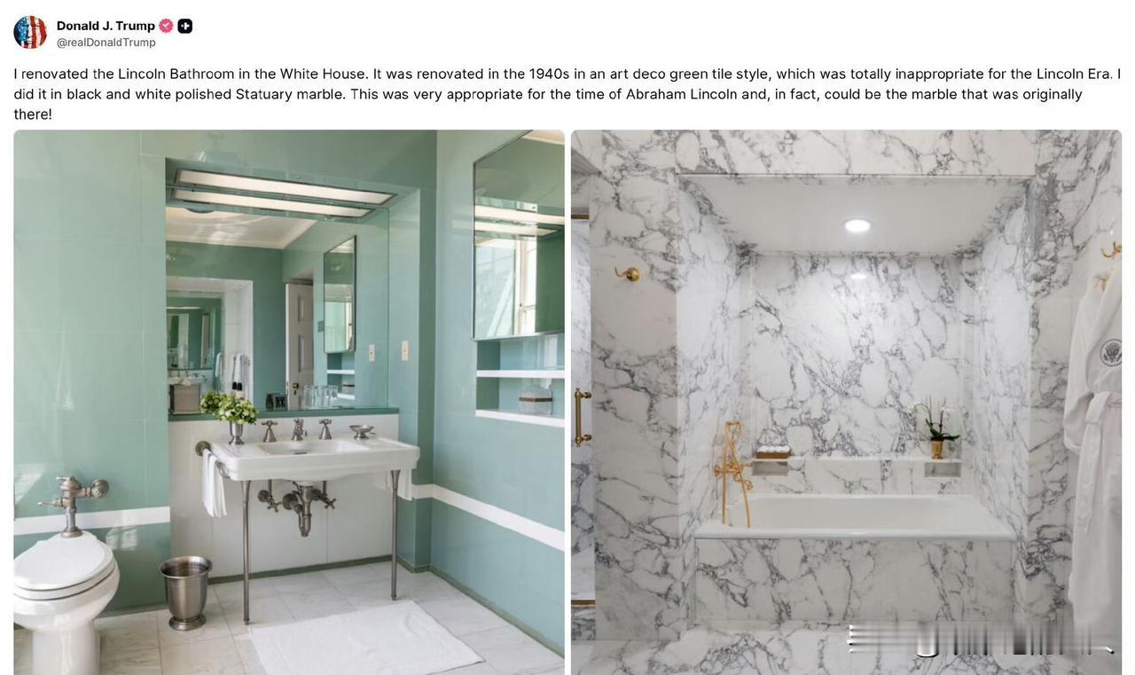 就在刚刚, 特朗普发帖,完成了一件大事,他把白宫厕所和林肯浴室重新装修好了,看上