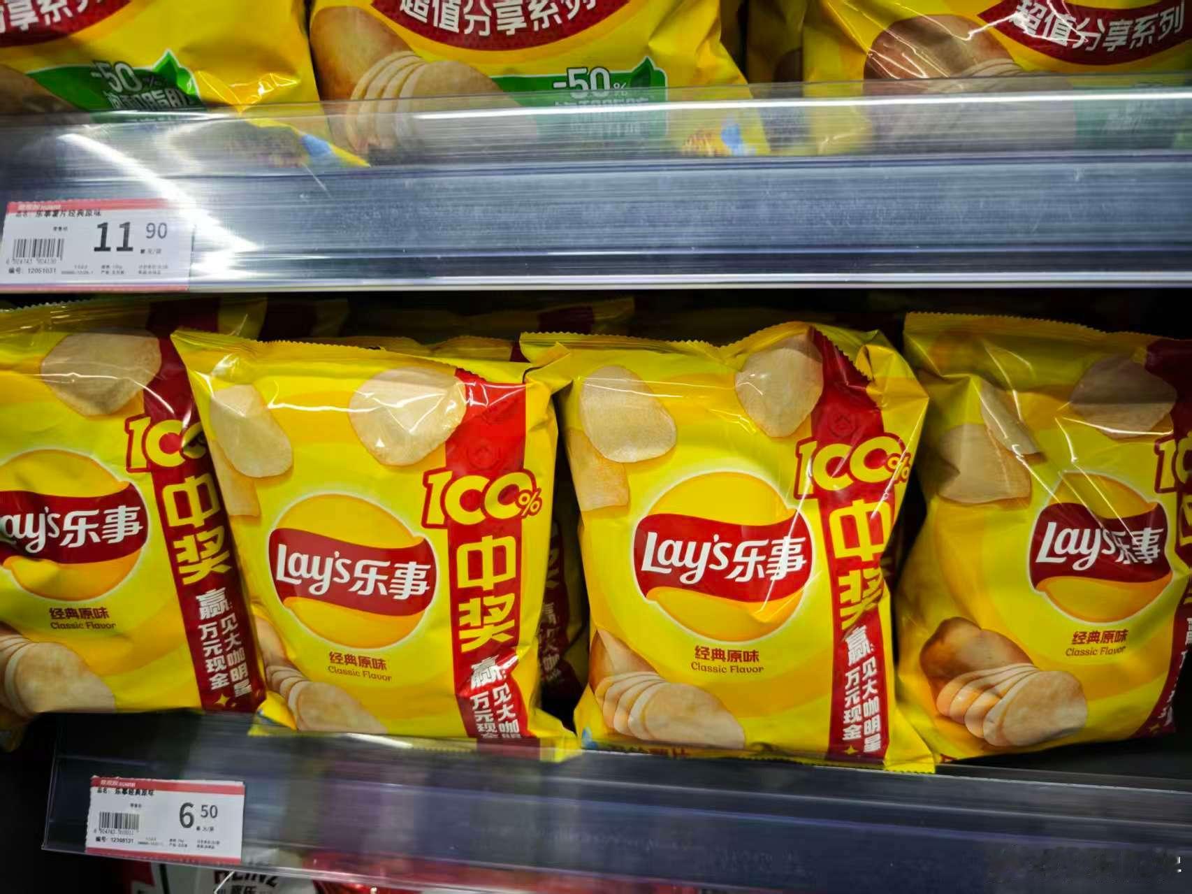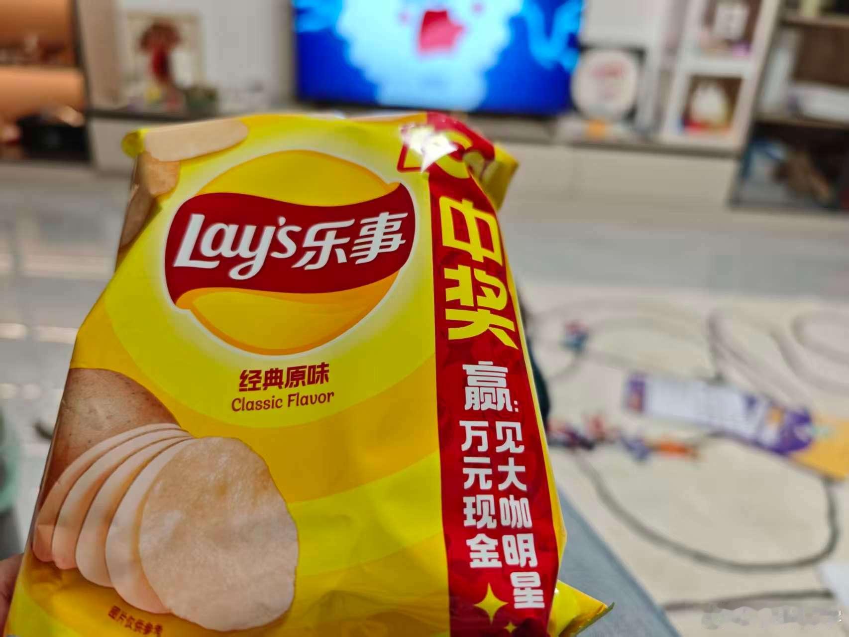 在薯片区看到了乐事的新包装经典口味,关键是还能抽奖,果断来两包。晚上在家可以抱着薯片看球赛了,顺便看看能不能中奖,和明显来个面对面。