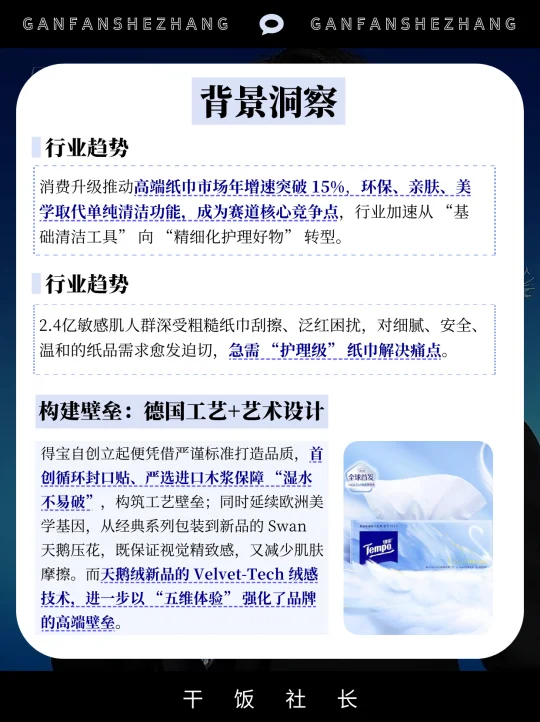 消费升级驱动下,高端纸巾市场年增速突破15%,环保、亲肤、美学成为核心竞争点。
