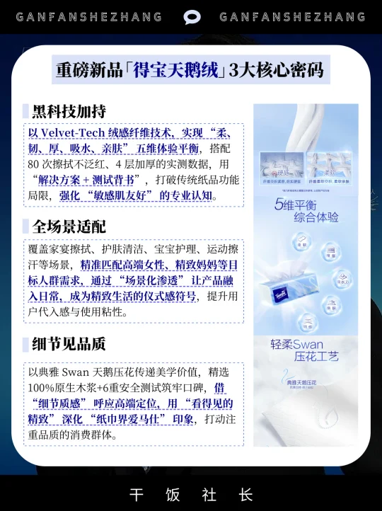 今年品牌再推新品【天鹅绒】软抽,以专属Velvet-Tech绒感纤维工艺,实现了“柔软、韧性、厚度、吸水力、亲肤度”的五维平衡体验,并通过“80 次擦拭不泛红”的真人测试结果,精准击中敏感肌人群需求。