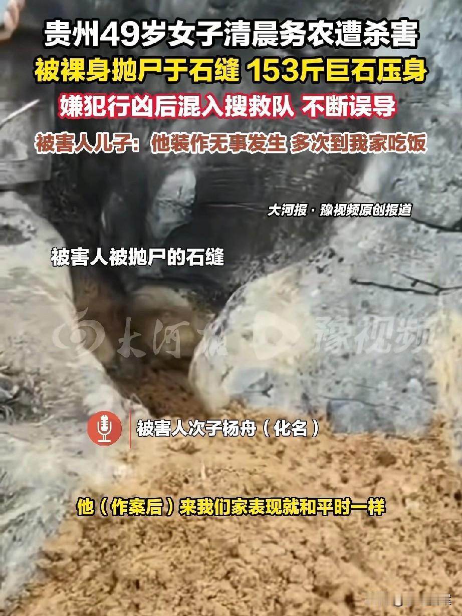 贵州被害抛尸的农妇长期独自住老家,嫌犯是老熟人,将对方勒死后裸身埋入石缝。因为相