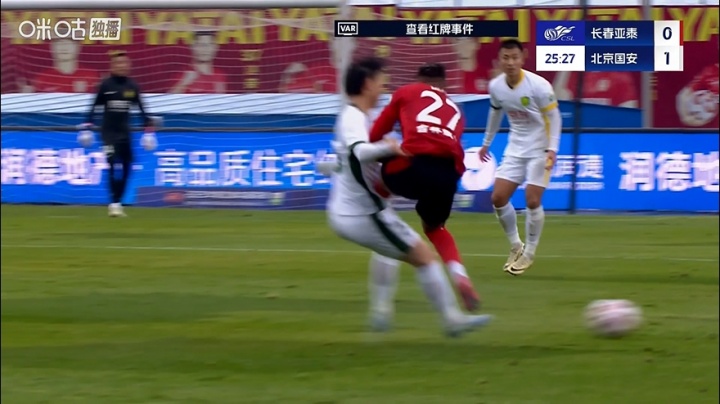 直播吧11月01日讯中超第29轮长春亚泰vs北京国安。比赛第26分钟,亚泰外援卡米洛踹中江文豪腹部,VAR介入认定非红牌。主裁判给了卡米洛黄牌。