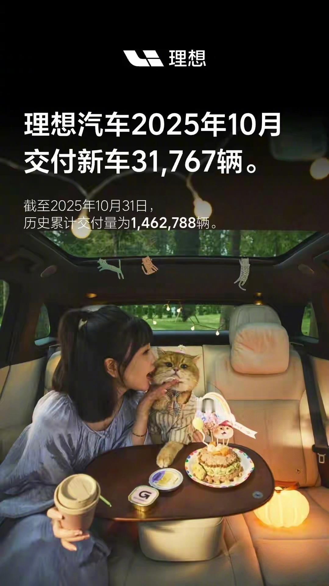理想汽车2025年10月交付新车31767辆,截至2025年10月31日,历史累计交付量为1462788辆。