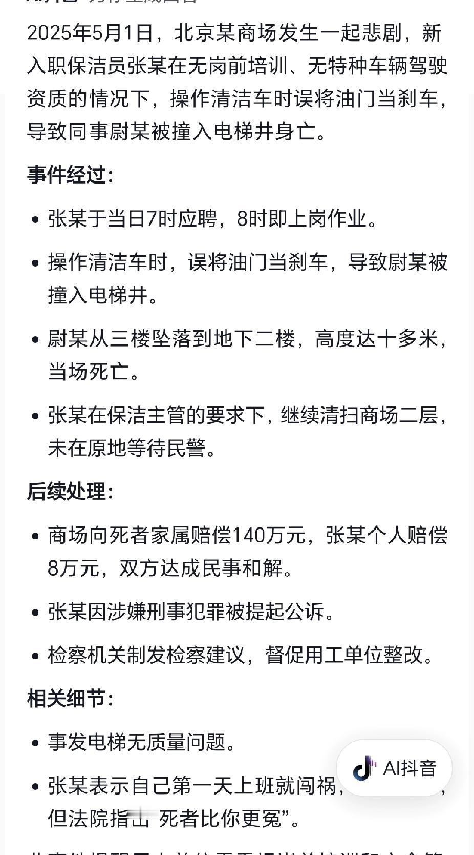 一个商场的管理者能冷漠到这种程度?新入职的保洁员张某无岗前培训。无特种车辆驾驶资质的情况下操作清洁车。导致同事魏某撞落电梯当场死亡。 可没没想到事故发生后,张某并没有做停留处理,而是按照主管的要求,继续清扫商场二层。把人当成什么了?面对同事竟然如此冷漠,假如身份互换,换成是顾客的话,那一定会重视起来。 这个主管的做法引起网络热议,有网友猜测:他到底是傻还是坏到心眼里。难道说,他想让老头自己逃逸,然后他好推卸责任?谁知道老哥太实在,他真的去扫地了。 更多的网友却认为大家想多了,这些人真的就知道干活苦钱,脑子是不好使的。傻傻的就知道干活呀,干活赚工资而已。 商场作为用人单位,管理疏漏,需承担主要责任,赔偿家属140万元。而当事人张某因存在重大过失。还可能涉嫌刑事犯罪过失致人死亡罪被提起公诉,他个人需赔偿8万元。 所以用人单位为什么之前不谨慎呢?因小失大,带来惨痛的代价。